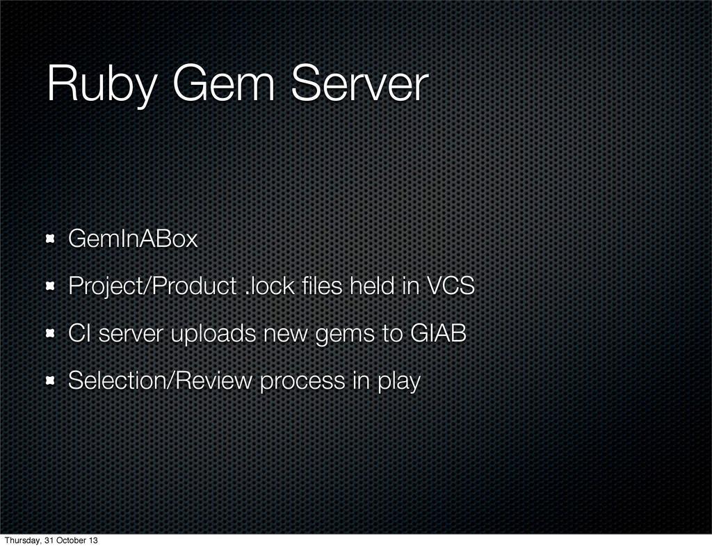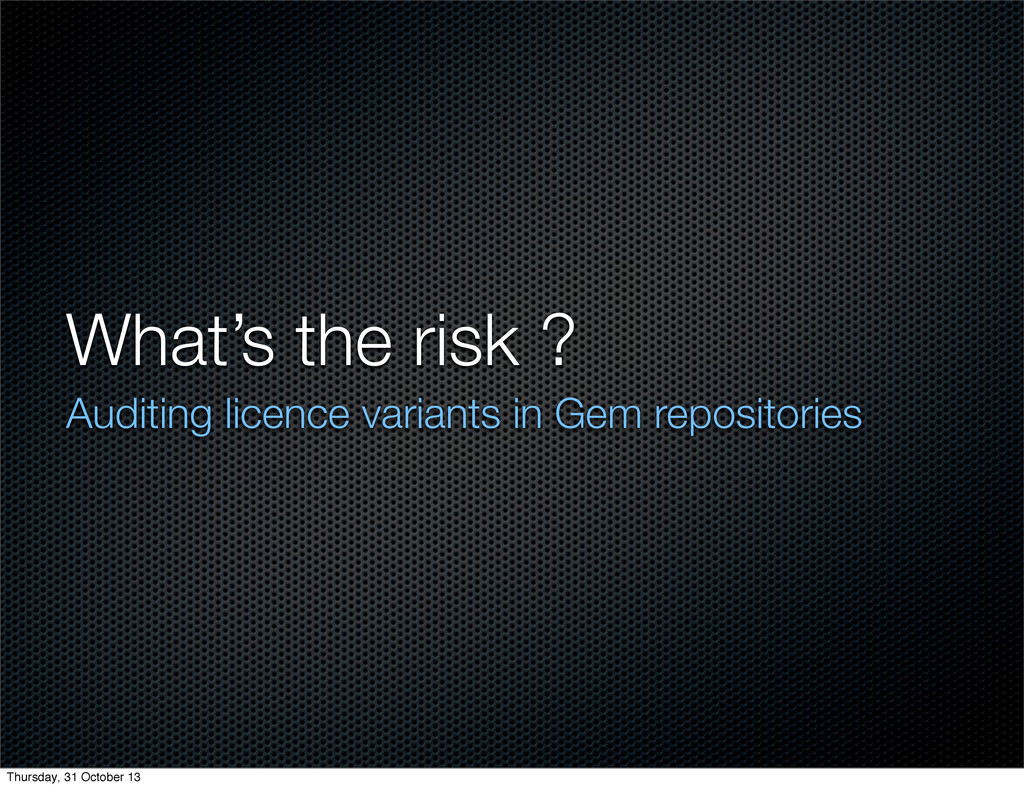 Talk given to Ruby Australia on how CGU audit the private Gem server to extract licence details, to ensure compliance and manage IP risk