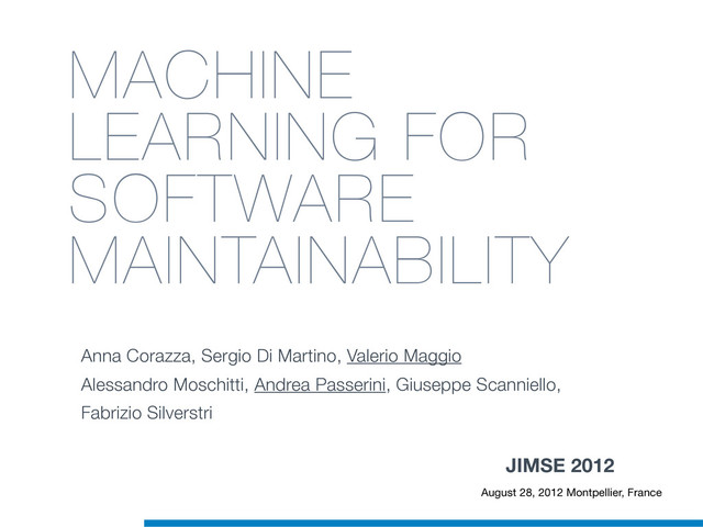 the source code • Combine different kind of information (lexical and structural) • Application of Kernel Methods to software artifacts • Provide flexible and computational effective solutions to analyze large data sets Advanced Machine Learning • Learning with syntactic/semantic information (Natural Language Processing) • Learning in relational domains (Structured-output learning, Logic Learning, Statistical Relational Learning) ADVANCED MACHINE LEARNING FOR SOFTWARE MAINTENANCE
