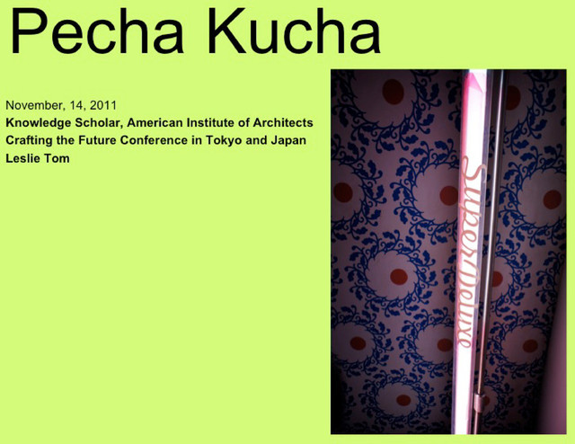 Pecha Kucha, American Institute of Architects Nov. 2011, in Tokyo, Japan for Crafting the Future Conference for Knowledge Scholar program.