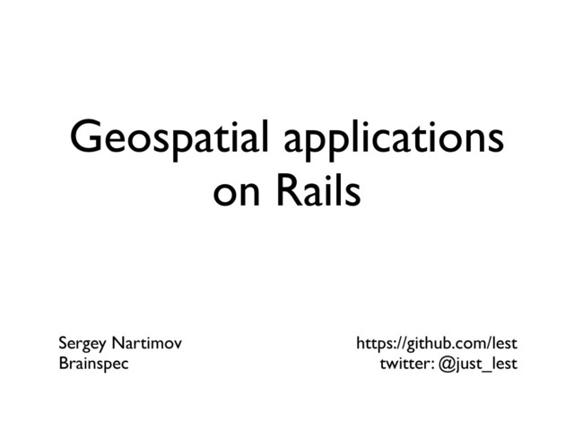 Geospatial applications on Rails Sergey Nartimov Brainspec https://github.com/lest twitter: @just_lest