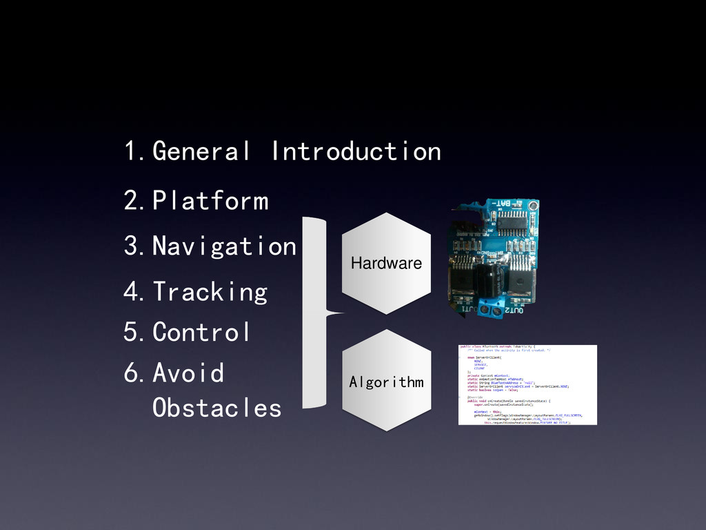 1.General Introduction 3.Navigation 4.Tracking 5.Control 6.Avoid Obstacles Algorithm Hardware 2.Platform