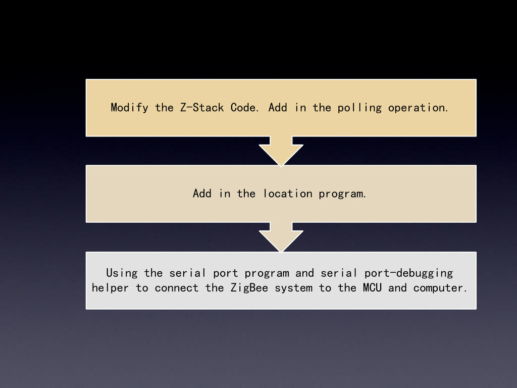 connect the ZigBee system to the MCU and computer. Add in the location program. Modify the Z-Stack Code. Add in the polling operation.
