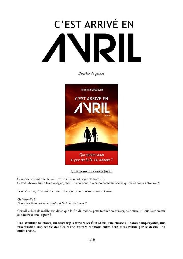 disait que demain, votre ville serait rayée de la carte ? Si vous deviez fuir à la campagne, chez un ami dont la maison cache un secret qui va changer votre vie ? Pour Vincent, c'est arrivé en avril. Le jour de sa rencontre avec Karine. Qui est-elle ? Pourquoi tient elle à se rendre à Sedona, Arizona ? Car s'il existe de meilleures dates que la fin du monde pour tomber amoureux, se pourrait-il que leur amour soit notre ultime espoir ? Une aventure haletante, un road trip à travers les États-Unis, une chasse à l'homme impitoyable, une machination implacable doublée d'une histoire d'amour entre deux êtres réunis par le destin... ou autre chose... 1/10