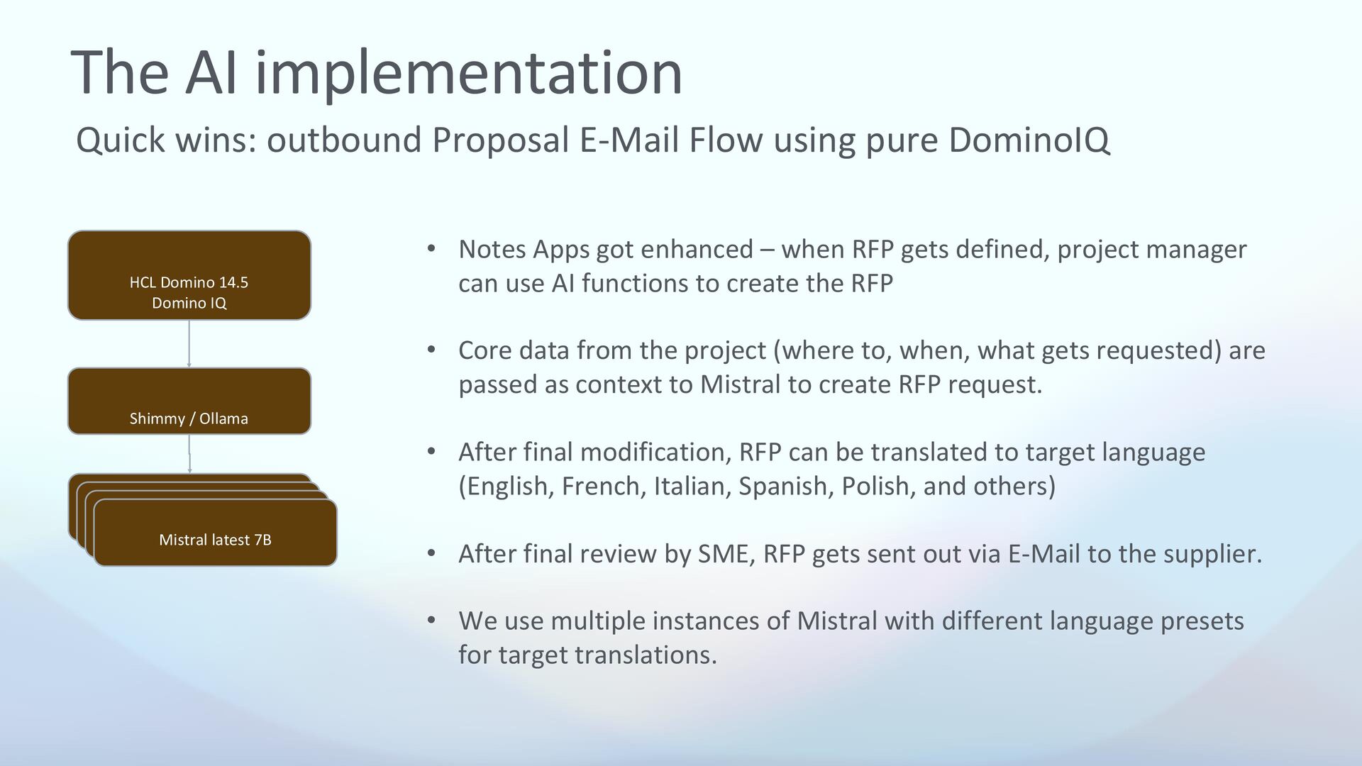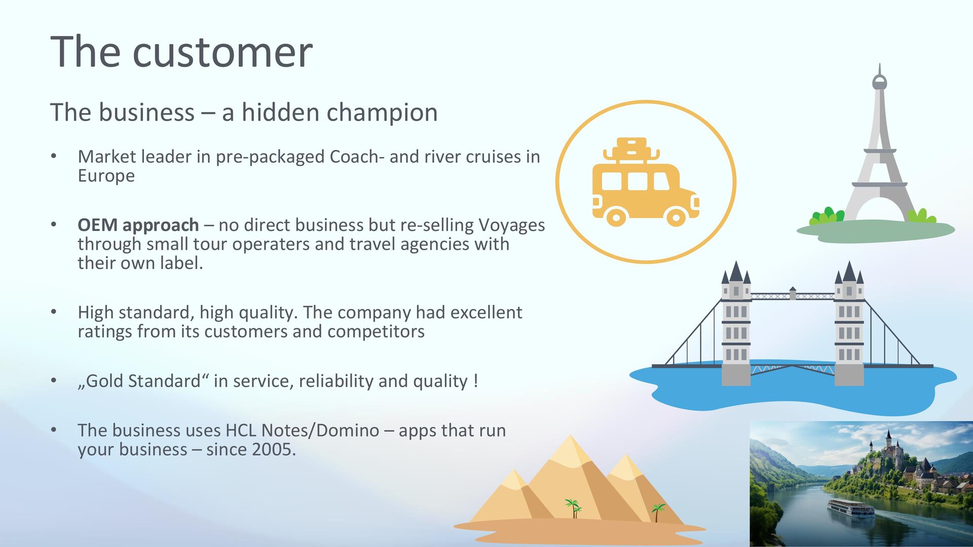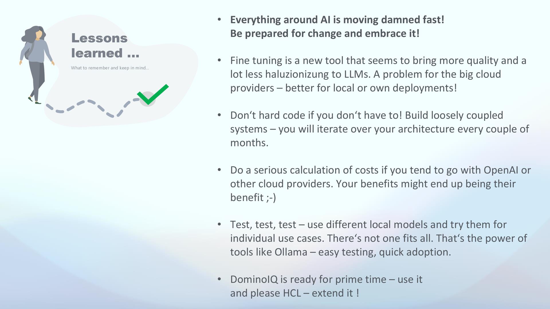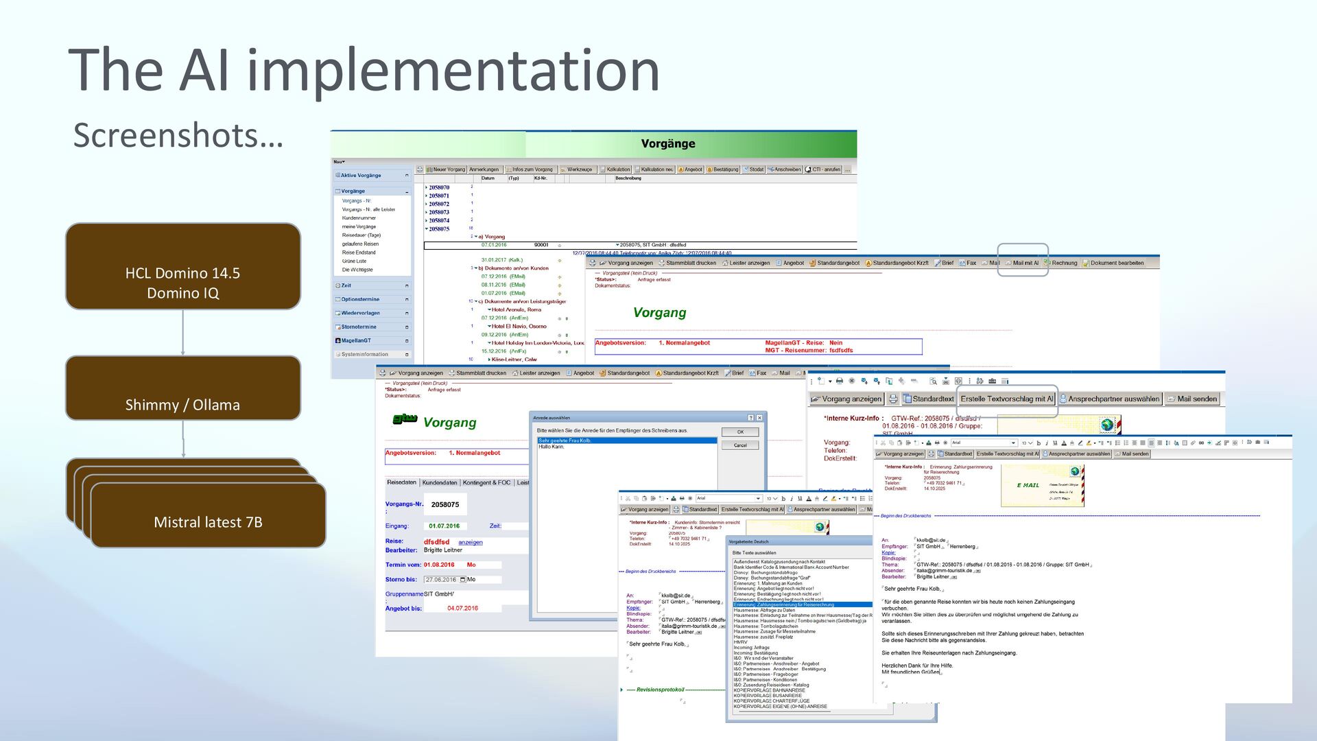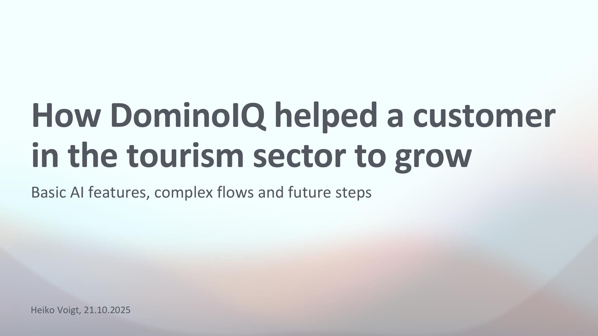 In the spring of this year (2025) we started with the first Beta Implementations of the new Domino IQ based features and functions at a company for packaged coach tours and river cruises in Germany. The company is one of the market leaders in this sector reselling packaged travel arrangements in the whole DACH Region. During the COVID season, the company went through rough times, almost going bankrupt with revenues coming to a total halt during the pandemic. During that time, layoffs had been necessary and a large amount of highly qualified speciallists lost their jobs and went into different professions. Fast forward to today - the market segement is booming and the company is grwoing rapdidly, so fast, that they are not able to find enough skilled personell to meet the growth. As a long term HCL Notes/Domino user, we sat down and came up with an idea, how Domino IQ could come to the rescue - let complex marketing and controlling tasks be automated using LLMs, RAG and MCP servers, allowing the customer to do a lot more with less - and meet their goals to regrow the business in a lot more efficient way than before. In this presentation, I will talk about the use cases and the business impact that using AI and Domino IQ had. Also, I will. give an overview of the technical implementation Join me on a customer journey through making productive use of AI and Domino IQ!