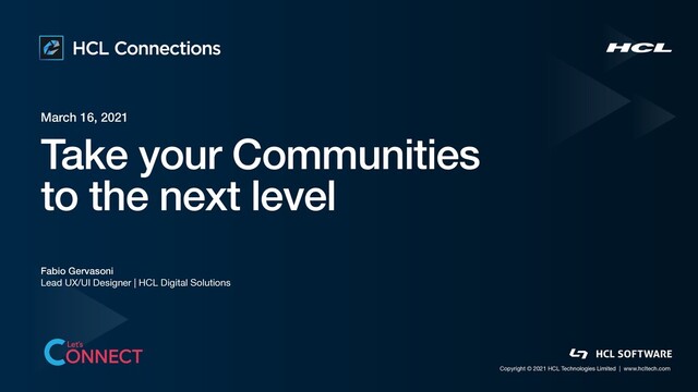 Connections 7 offers new ways of tweaking and customizing the homepage layout of your community and new capabilities made possible by new Connections templates. In this session, Fabio Gervasoni, head of the HCL Connections Design team, will share design tips and best practices on developing Communities that are suited to your needs, attractive and engaging for your specific audiences.