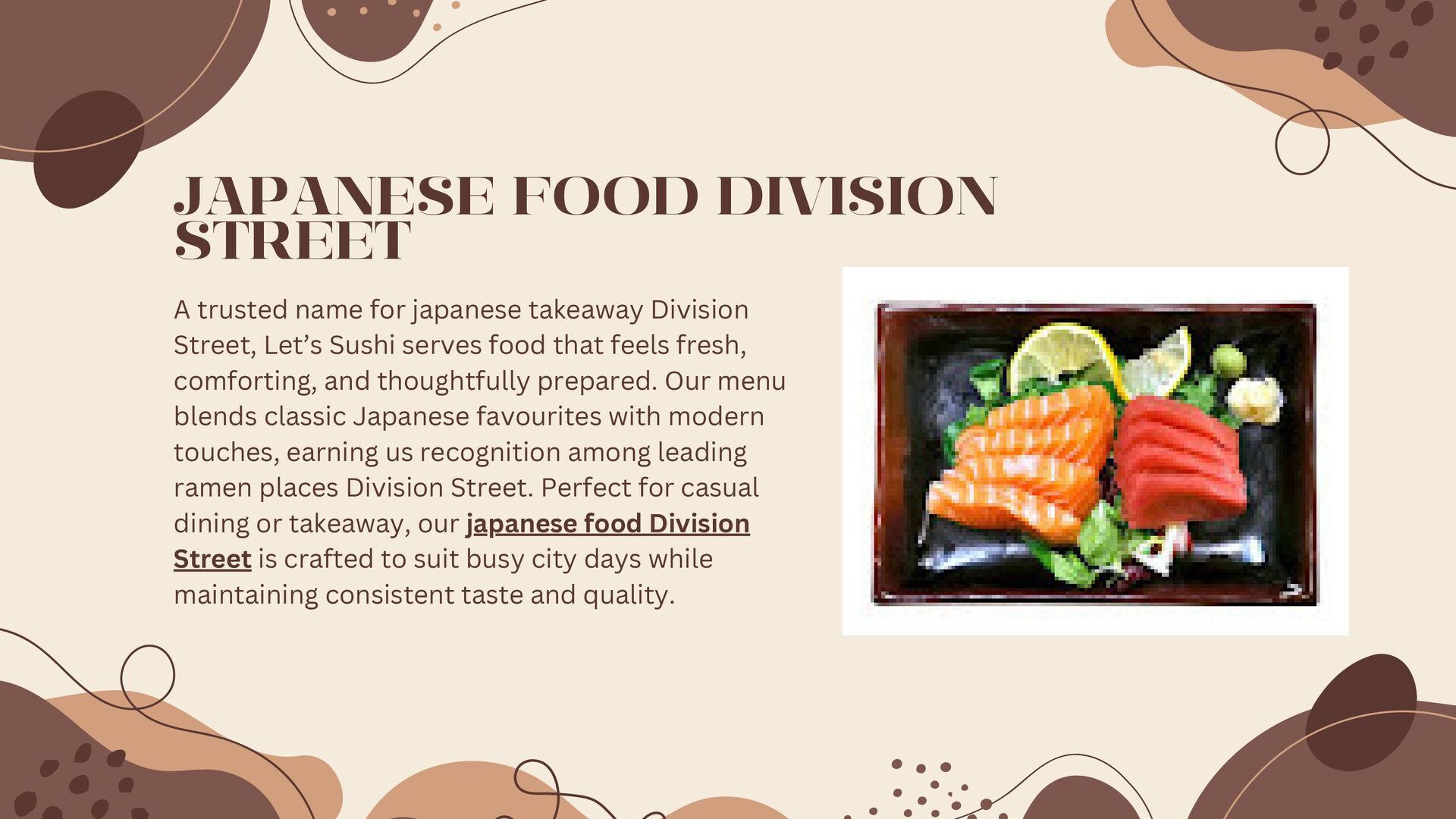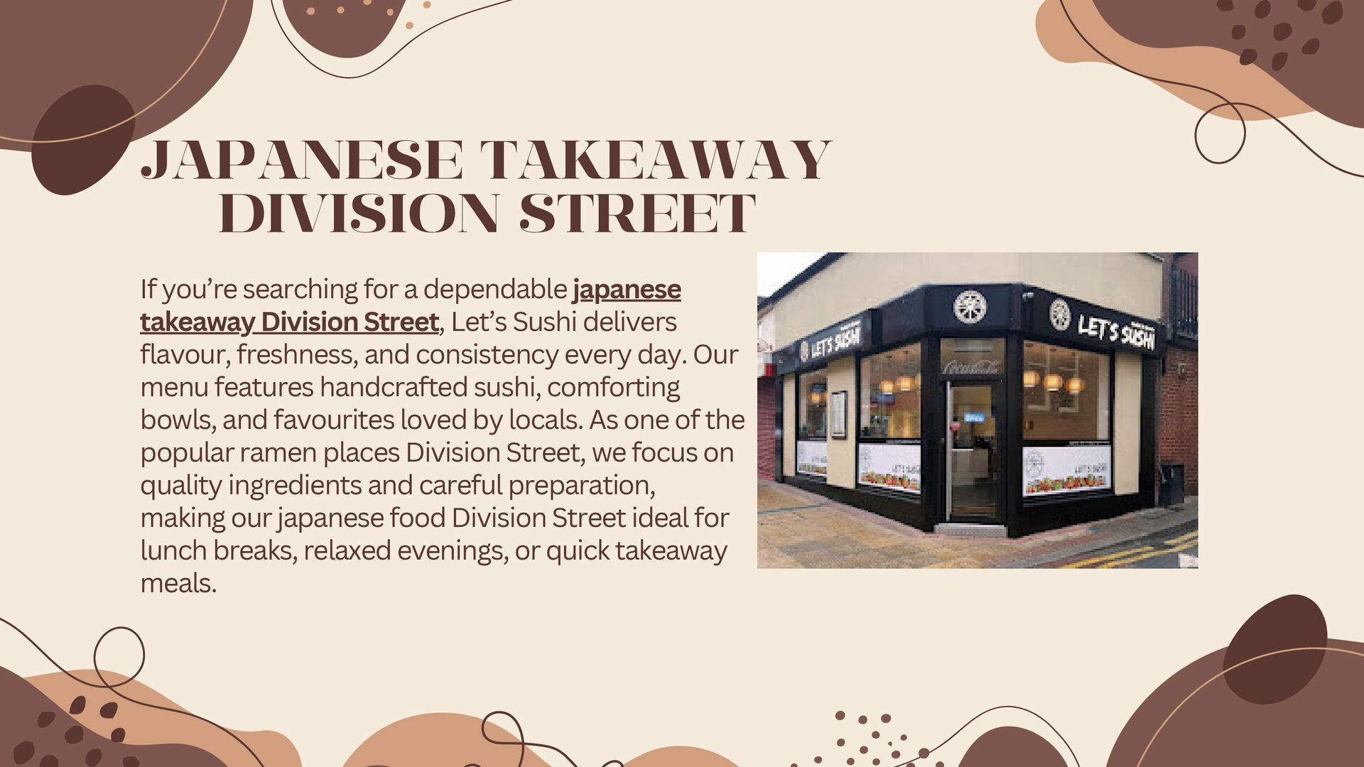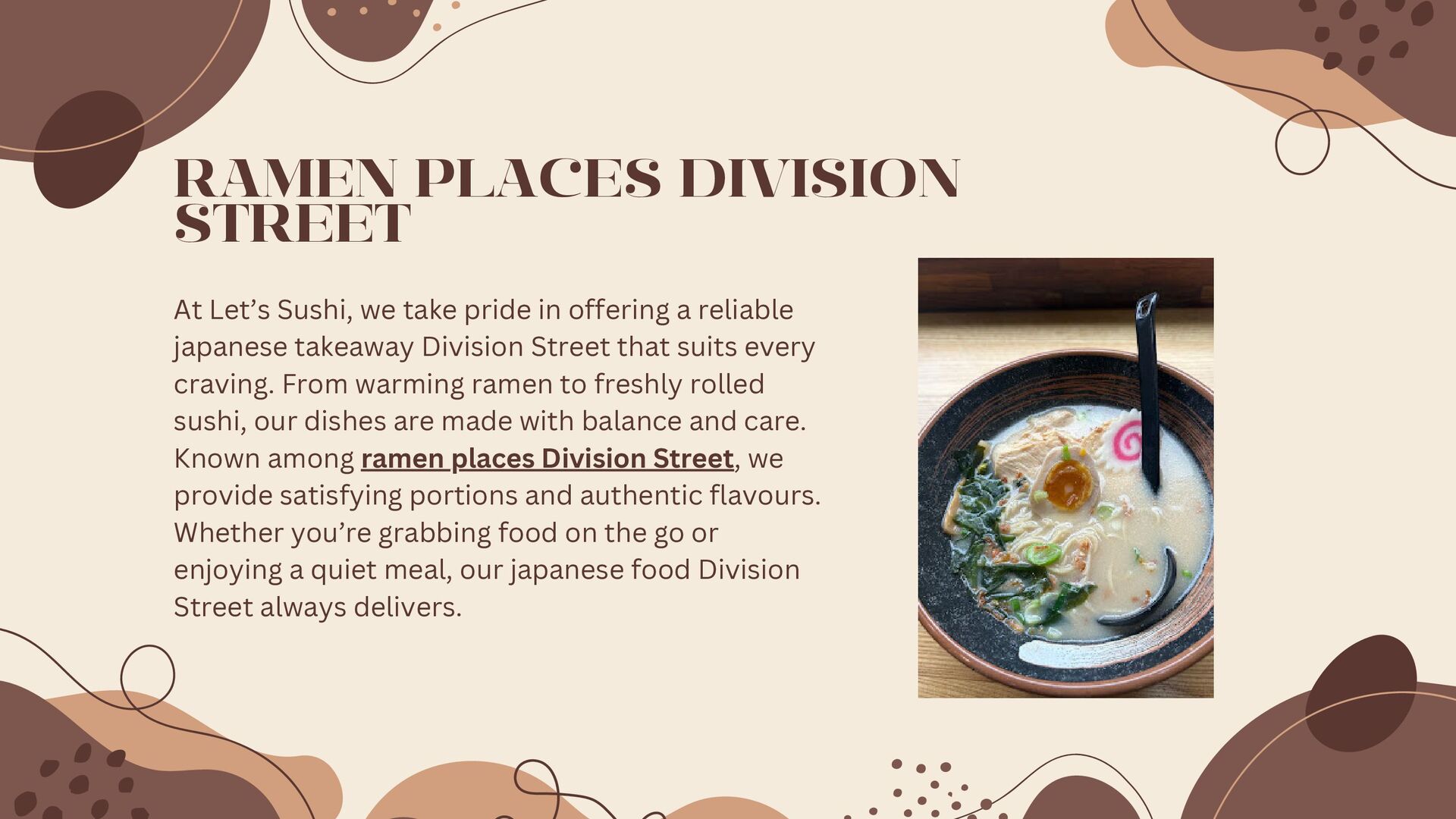 A reliable choice for japanese takeaway Division Street, Let’s Sushi serves freshly prepared sushi, warming ramen, and well-loved Japanese favourites. Known among popular ramen places Division Street, we focus on balanced flavours and quality ingredients. Ideal for quick meals or relaxed evenings, our japanese food Division Street is crafted to satisfy every craving.