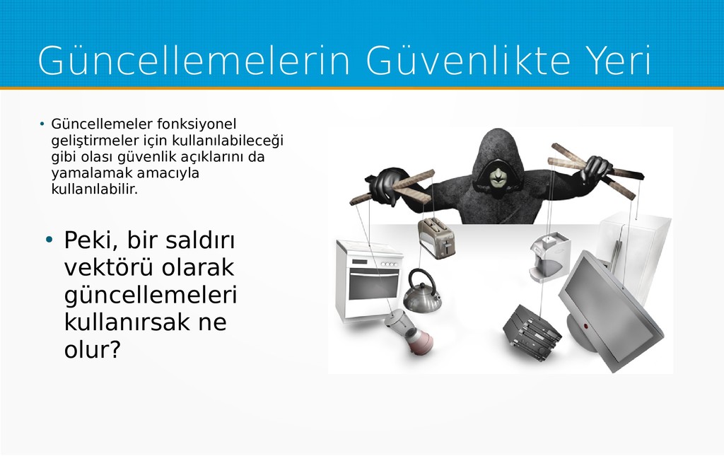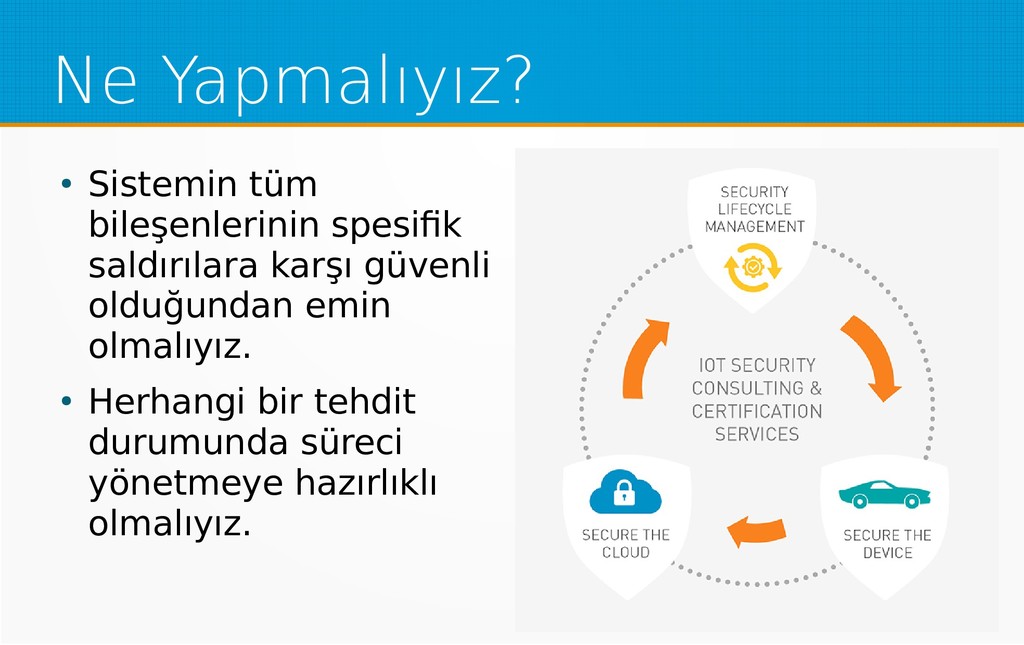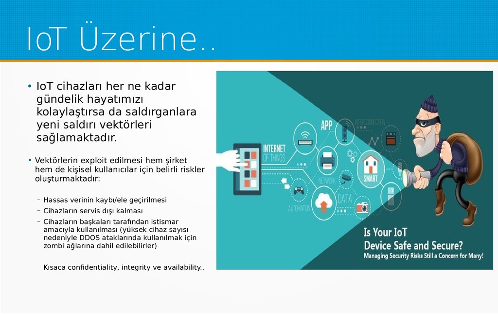 kolaylaştırsa da saldırganlara yeni saldırı vektörleri sağlamaktadır. • Vektörlerin exploit edilmesi hem şirket hem de kişisel kullanıcılar için belirli riskler oluşturmaktadır: – Hassas verinin kaybı/ele geçirilmesi – Cihazların servis dışı kalması – Cihazların başkaları tarafından istismar amacıyla kullanılması (yüksek cihaz sayısı nedeniyle DDOS ataklarında kullanılmak için zombi ağlarına dahil edilebilirler) Kısaca confidentiality, integrity ve availability..