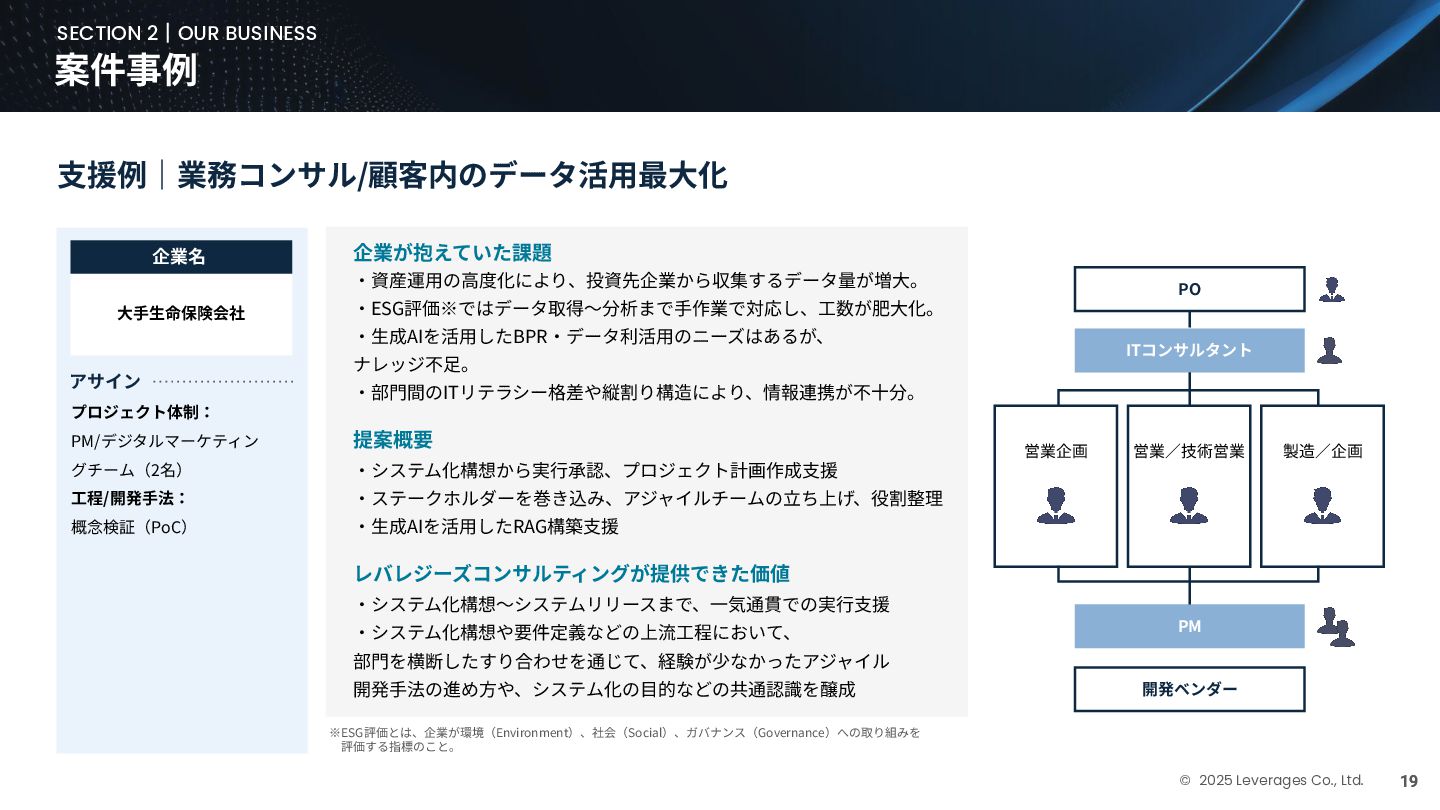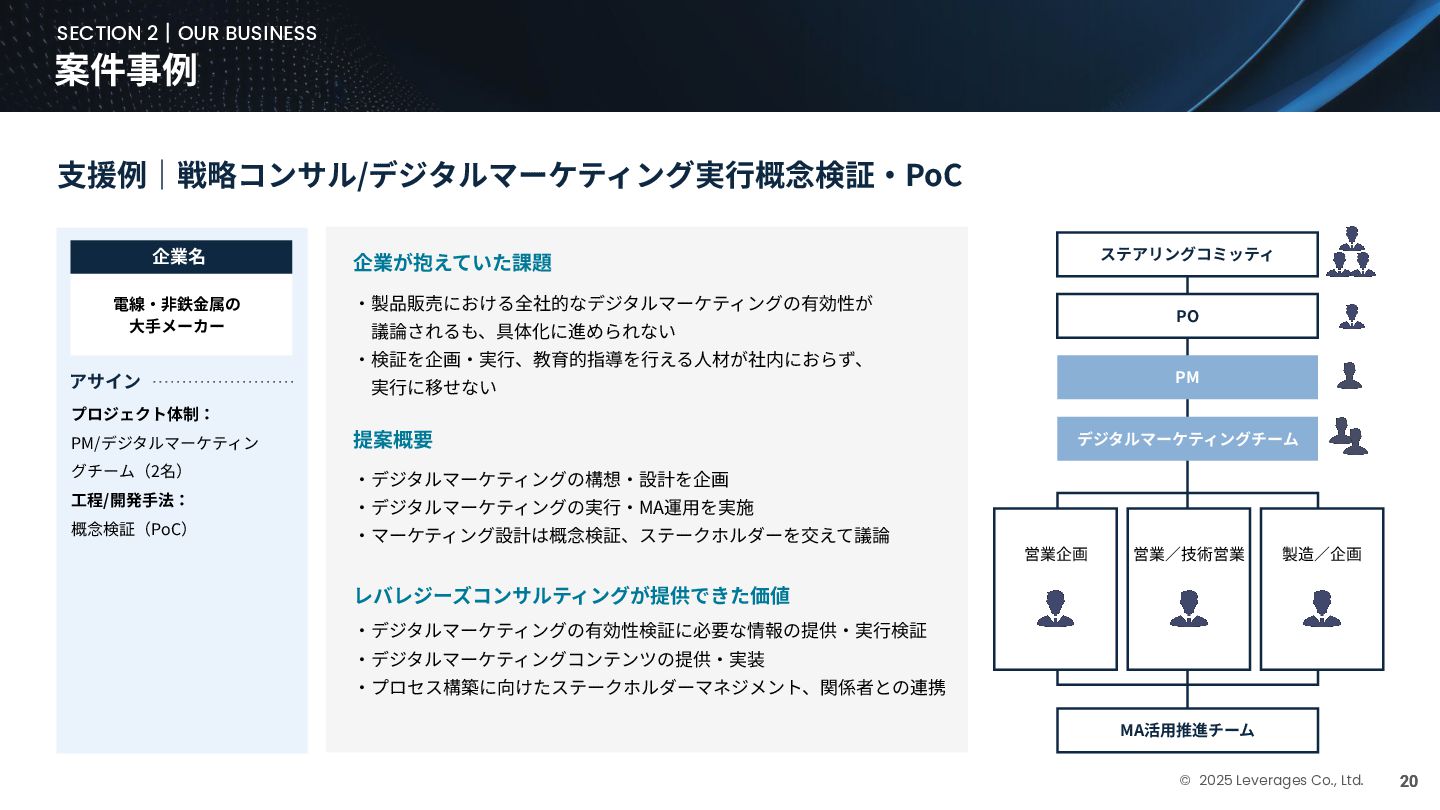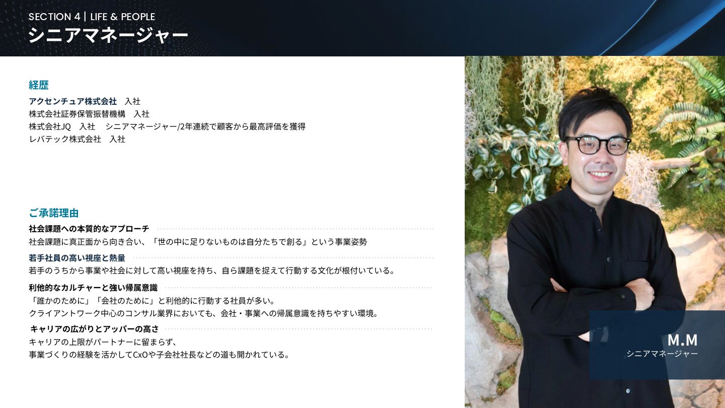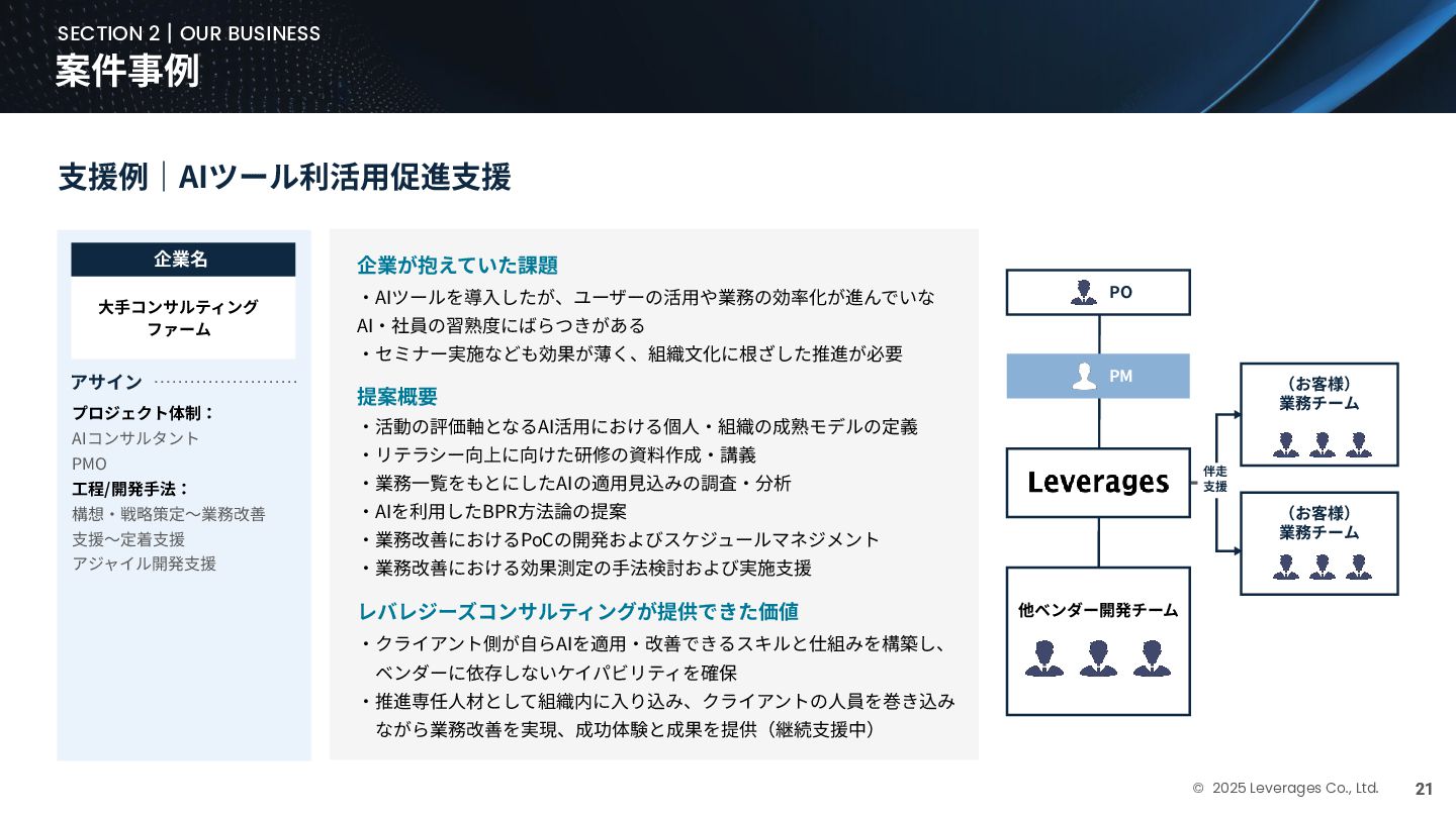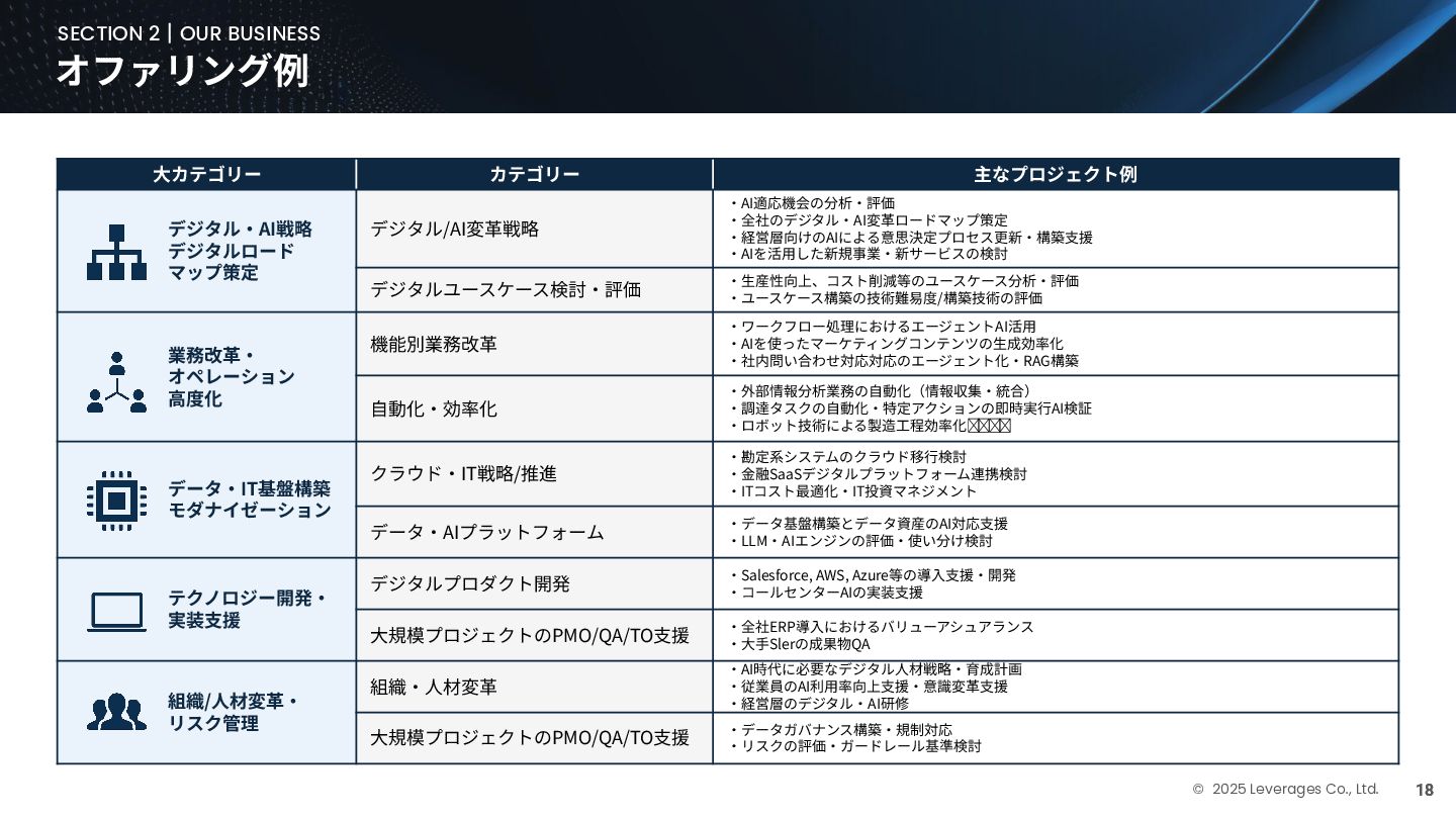 BUSINESS ⼤カテゴリー カテゴリー 主なプロジェクト例 デジタル‧AI戦略 デジタルロード マップ策定 デジタル/AI変⾰戦略 ‧AI適応機会の分析‧評価 ‧全社のデジタル‧AI変⾰ロードマップ策定 ‧経営層向けのAIによる意思決定プロセス更新‧構築⽀援 ‧AIを活⽤した新規事業‧新サービスの検討 デジタルユースケース検討‧評価 ‧⽣産性向上、コスト削減等のユースケース分析‧評価 ‧ユースケース構築の技術難易度/構築技術の評価 業務改⾰‧ オペレーション ⾼度化 機能別業務改⾰ ‧ワークフロー処理におけるエージェントAI活⽤ ‧AIを使ったマーケティングコンテンツの⽣成効率化 ‧社内問い合わせ対応対応のエージェント化‧RAG構築 ⾃動化‧効率化 ‧外部情報分析業務の⾃動化(情報収集‧統合) ‧調達タスクの⾃動化‧特定アクションの即時実⾏AI検証 ‧ロボット技術による製造⼯程効率化余地の検証 データ‧IT基盤構築 モダナイゼーション クラウド‧IT戦略/推進 ‧勘定系システムのクラウド移⾏検討 ‧⾦融SaaSデジタルプラットフォーム連携検討 ‧ITコスト最適化‧IT投資マネジメント データ‧AIプラットフォーム ‧データ基盤構築とデータ資産のAI対応⽀援 ‧LLM‧AIエンジンの評価‧使い分け検討 テクノロジー開発‧ 実装⽀援 デジタルプロダクト開発 ‧Salesforce, AWS, Azure等の導⼊⽀援‧開発 ‧コールセンターAIの実装⽀援 ⼤規模プロジェクトのPMO/QA/TO⽀援 ‧全社ERP導⼊におけるバリューアシュアランス ‧⼤⼿Slerの成果物QA 組織/⼈材変⾰‧ リスク管理 組織‧⼈材変⾰ ‧AI時代に必要なデジタル⼈材戦略‧育成計画 ‧従業員のAI利⽤率向上⽀援‧意識変⾰⽀援 ‧経営層のデジタル‧AI研修 ⼤規模プロジェクトのPMO/QA/TO⽀援 ‧データガバナンス構築‧規制対応 ‧リスクの評価‧ガードレール基準検討