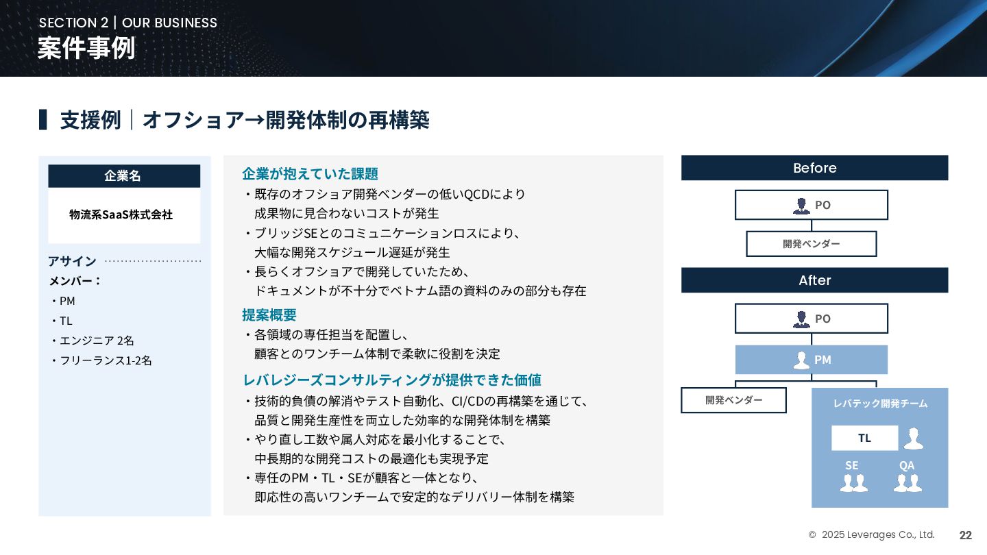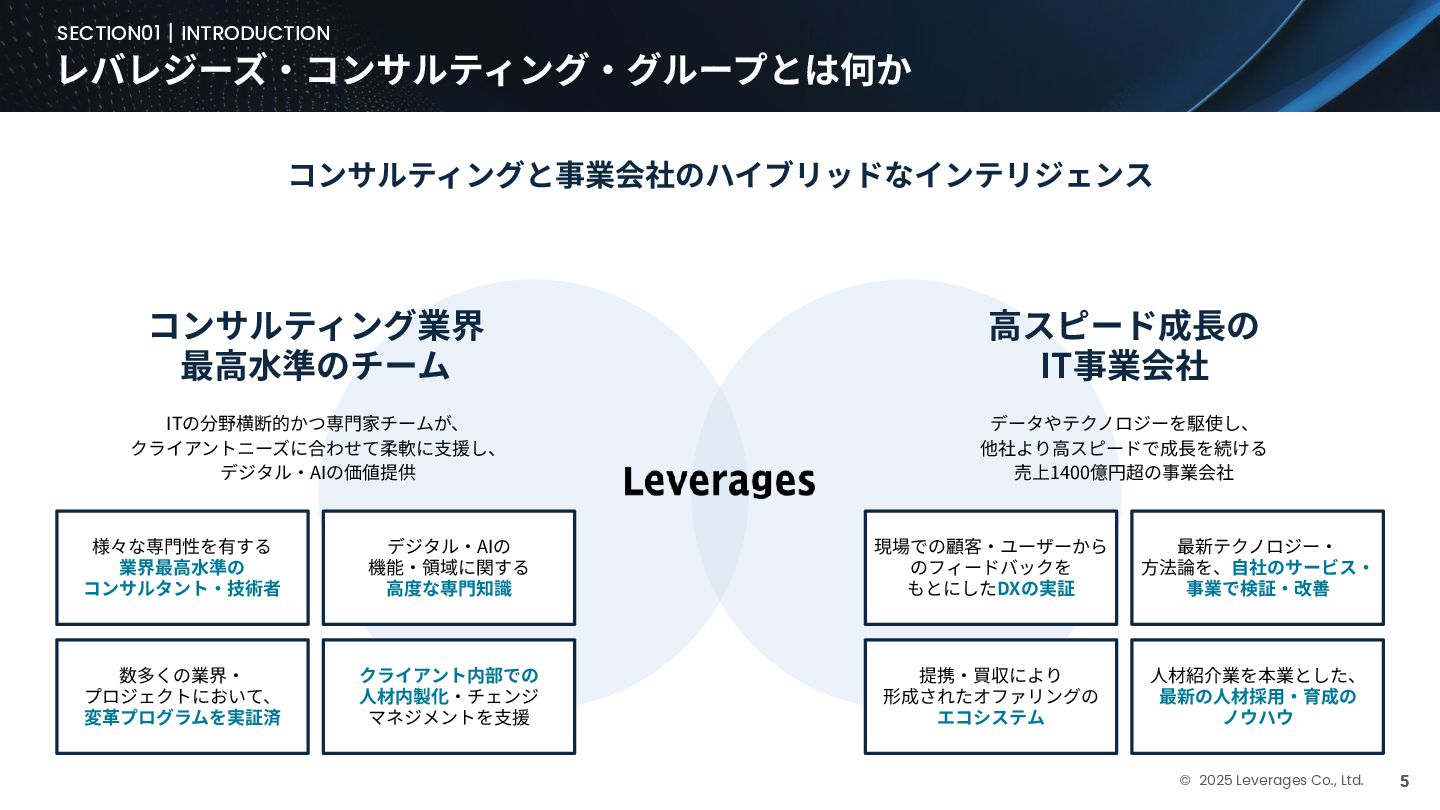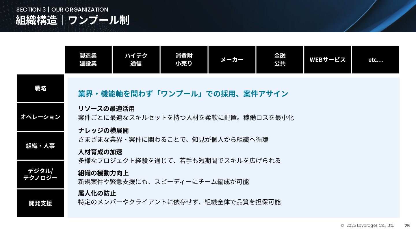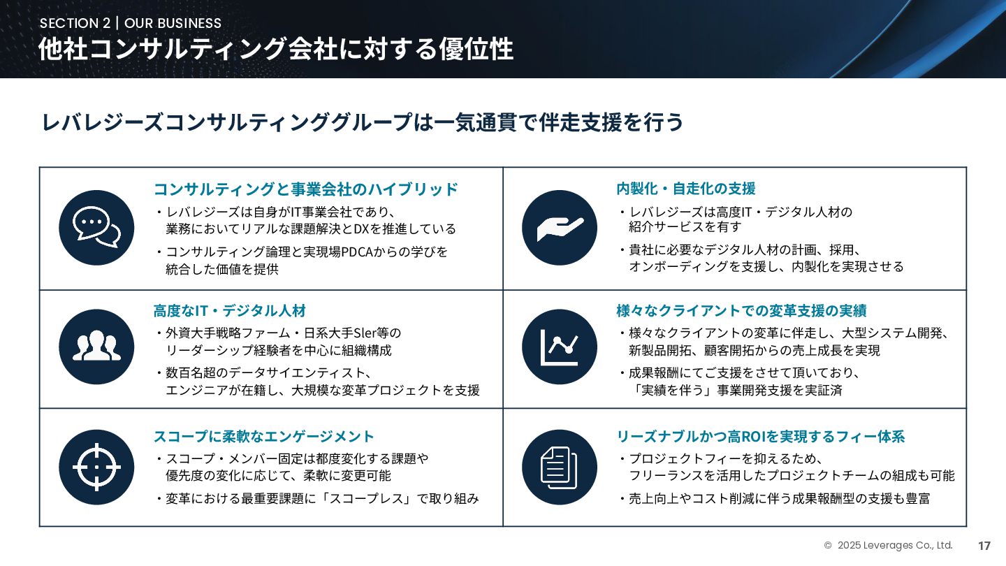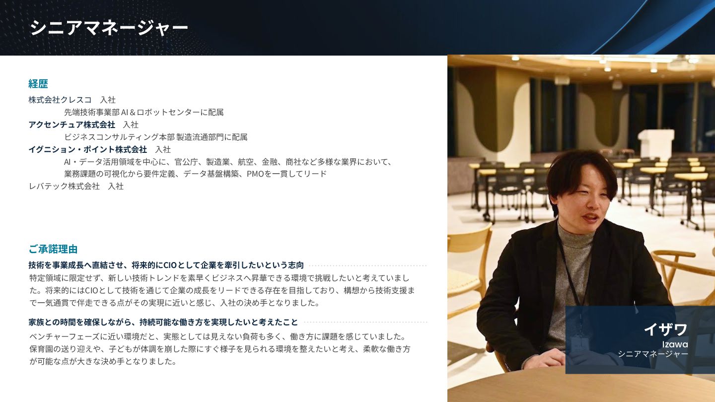 BUSINESS ⼤カテゴリー カテゴリー 主なプロジェクト例 デジタル‧AI戦略 デジタルロード マップ策定 デジタル/AI変⾰戦略 ‧AI適応機会の分析‧評価 ‧全社のデジタル‧AI変⾰ロードマップ策定 ‧経営層向けのAIによる意思決定プロセス更新‧構築⽀援 ‧AIを活⽤した新規事業‧新サービスの検討 デジタルユースケース検討‧評価 ‧⽣産性向上、コスト削減等のユースケース分析‧評価 ‧ユースケース構築の技術難易度/構築技術の評価 業務改⾰‧ オペレーション ⾼度化 機能別業務改⾰ ‧ワークフロー処理におけるエージェントAI活⽤ ‧AIを使ったマーケティングコンテンツの⽣成効率化 ‧社内問い合わせ対応対応のエージェント化‧RAG構築 ⾃動化‧効率化 ‧外部情報分析業務の⾃動化(情報収集‧統合) ‧調達タスクの⾃動化‧特定アクションの即時実⾏AI検証 ‧ロボット技術による製造⼯程効率化余地の検証 データ‧IT基盤構築 モダナイゼーション クラウド‧IT戦略/推進 ‧勘定系システムのクラウド移⾏検討 ‧⾦融SaaSデジタルプラットフォーム連携検討 ‧ITコスト最適化‧IT投資マネジメント データ‧AIプラットフォーム ‧データ基盤構築とデータ資産のAI対応⽀援 ‧LLM‧AIエンジンの評価‧使い分け検討 テクノロジー開発‧ 実装⽀援 デジタルプロダクト開発 ‧Salesforce, AWS, Azure等の導⼊⽀援‧開発 ‧コールセンターAIの実装⽀援 ⼤規模プロジェクトのPMO/QA/TO⽀援 ‧全社ERP導⼊におけるバリューアシュアランス ‧⼤⼿Slerの成果物QA 組織/⼈材変⾰‧ リスク管理 組織‧⼈材変⾰ ‧AI時代に必要なデジタル⼈材戦略‧育成計画 ‧従業員のAI利⽤率向上⽀援‧意識変⾰⽀援 ‧経営層のデジタル‧AI研修 ⼤規模プロジェクトのPMO/QA/TO⽀援 ‧データガバナンス構築‧規制対応 ‧リスクの評価‧ガードレール基準検討