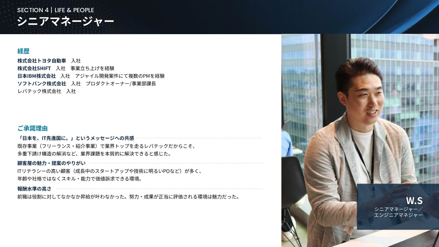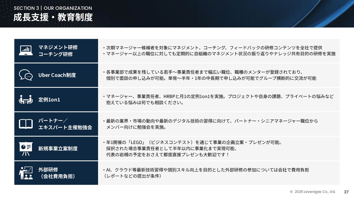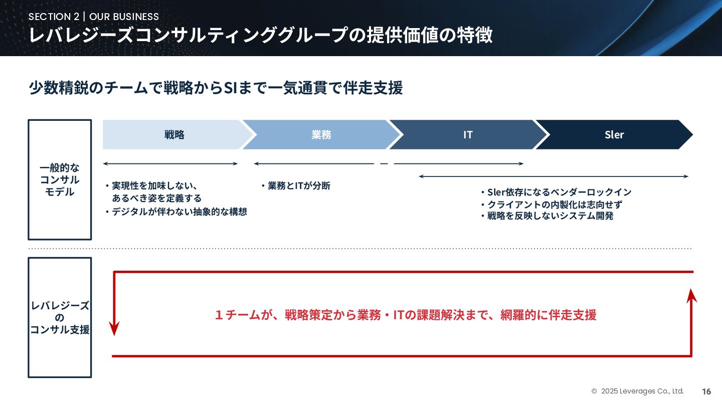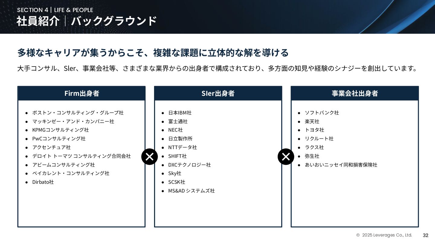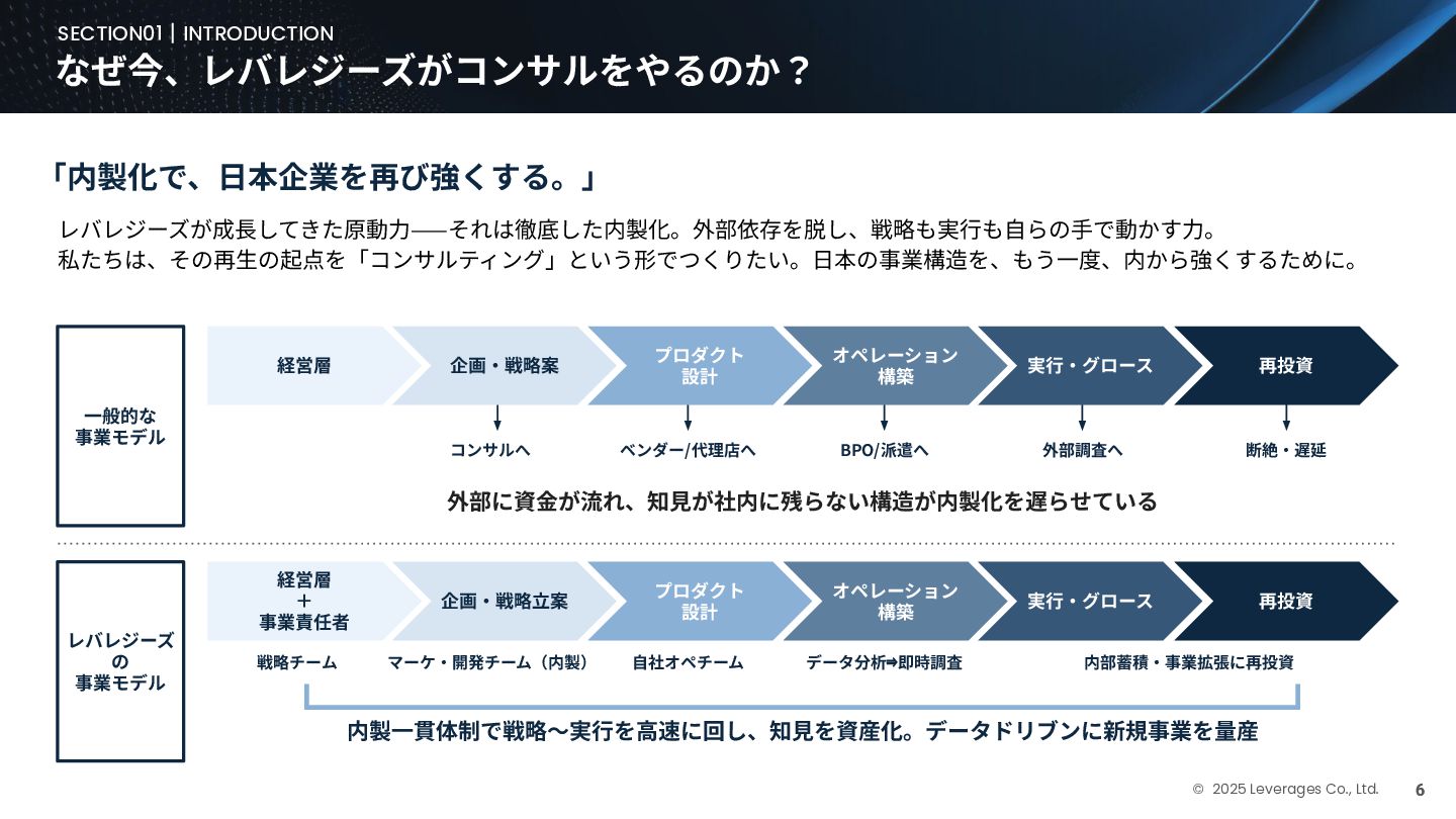 BUSINESS ⼤カテゴリー カテゴリー 主なプロジェクト例 デジタル‧AI戦略 デジタルロード マップ策定 デジタル/AI変⾰戦略 ‧AI適応機会の分析‧評価 ‧全社のデジタル‧AI変⾰ロードマップ策定 ‧経営層向けのAIによる意思決定プロセス更新‧構築⽀援 ‧AIを活⽤した新規事業‧新サービスの検討 デジタルユースケース検討‧評価 ‧⽣産性向上、コスト削減等のユースケース分析‧評価 ‧ユースケース構築の技術難易度/構築技術の評価 業務改⾰‧ オペレーション ⾼度化 機能別業務改⾰ ‧ワークフロー処理におけるエージェントAI活⽤ ‧AIを使ったマーケティングコンテンツの⽣成効率化 ‧社内問い合わせ対応対応のエージェント化‧RAG構築 ⾃動化‧効率化 ‧外部情報分析業務の⾃動化(情報収集‧統合) ‧調達タスクの⾃動化‧特定アクションの即時実⾏AI検証 ‧ロボット技術による製造⼯程効率化余地の検証 データ‧IT基盤構築 モダナイゼーション クラウド‧IT戦略/推進 ‧勘定系システムのクラウド移⾏検討 ‧⾦融SaaSデジタルプラットフォーム連携検討 ‧ITコスト最適化‧IT投資マネジメント データ‧AIプラットフォーム ‧データ基盤構築とデータ資産のAI対応⽀援 ‧LLM‧AIエンジンの評価‧使い分け検討 テクノロジー開発‧ 実装⽀援 デジタルプロダクト開発 ‧Salesforce, AWS, Azure等の導⼊⽀援‧開発 ‧コールセンターAIの実装⽀援 ⼤規模プロジェクトのPMO/QA/TO⽀援 ‧全社ERP導⼊におけるバリューアシュアランス ‧⼤⼿Slerの成果物QA 組織/⼈材変⾰‧ リスク管理 組織‧⼈材変⾰ ‧AI時代に必要なデジタル⼈材戦略‧育成計画 ‧従業員のAI利⽤率向上⽀援‧意識変⾰⽀援 ‧経営層のデジタル‧AI研修 ⼤規模プロジェクトのPMO/QA/TO⽀援 ‧データガバナンス構築‧規制対応 ‧リスクの評価‧ガードレール基準検討