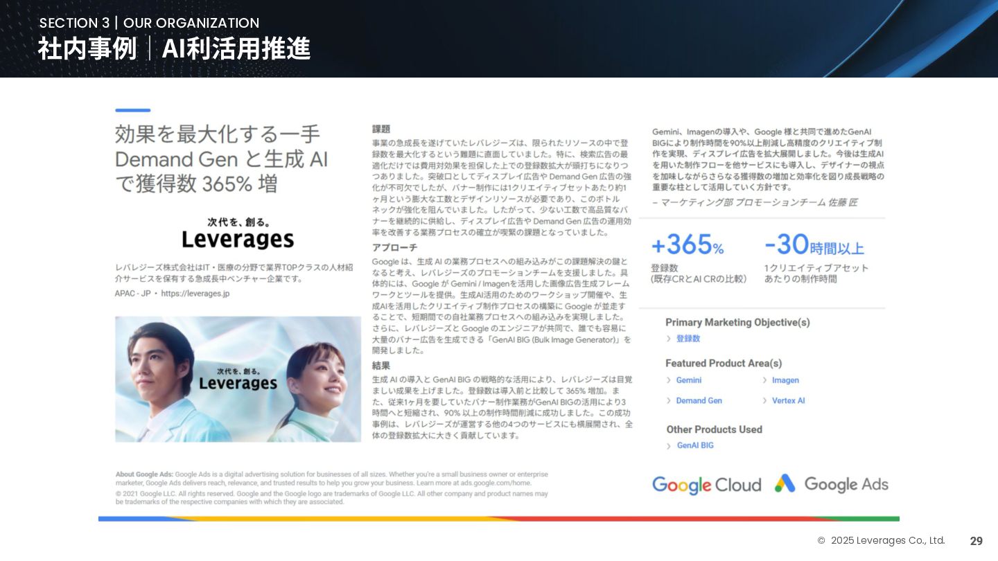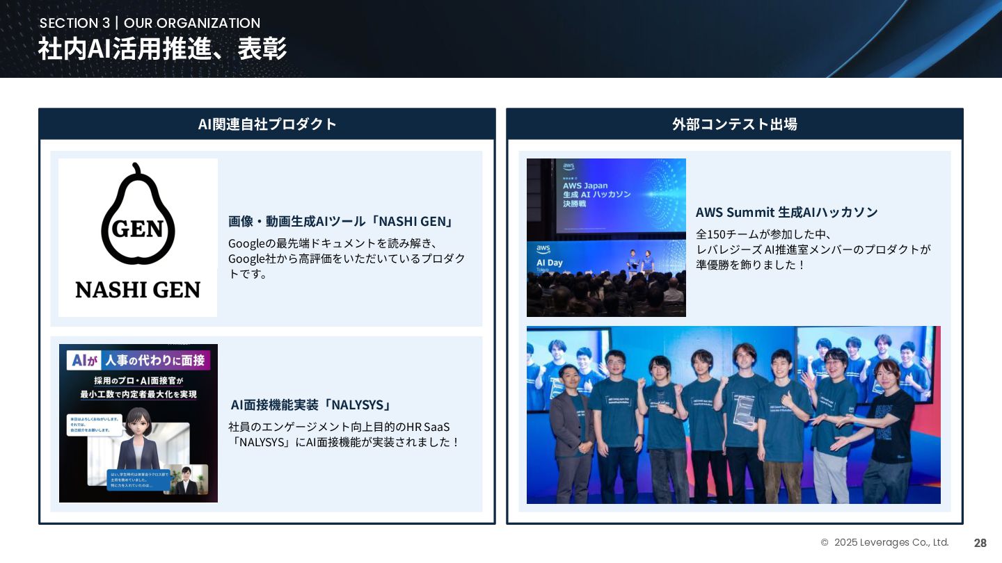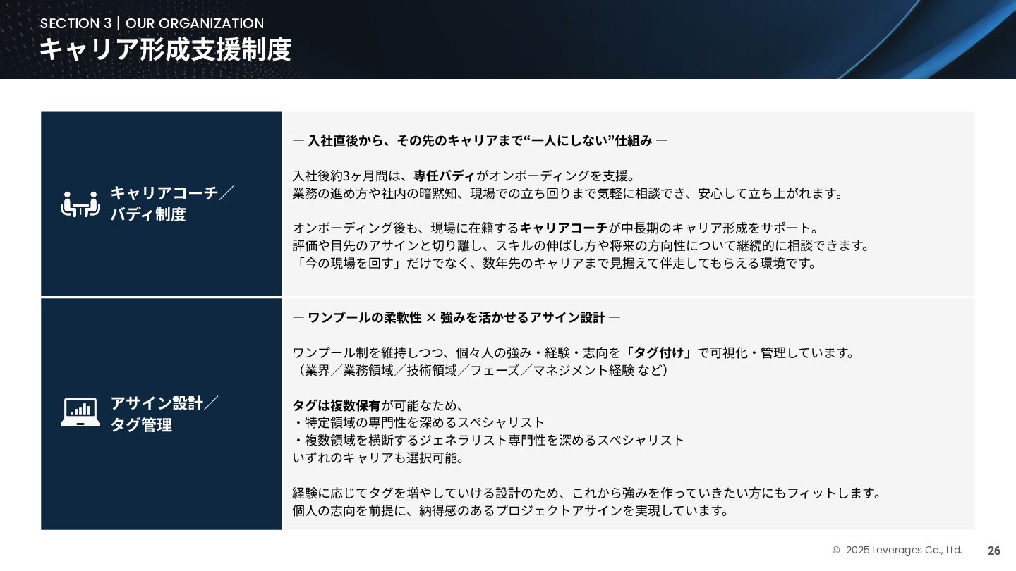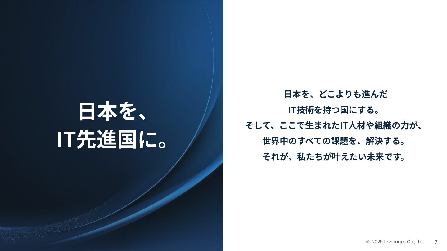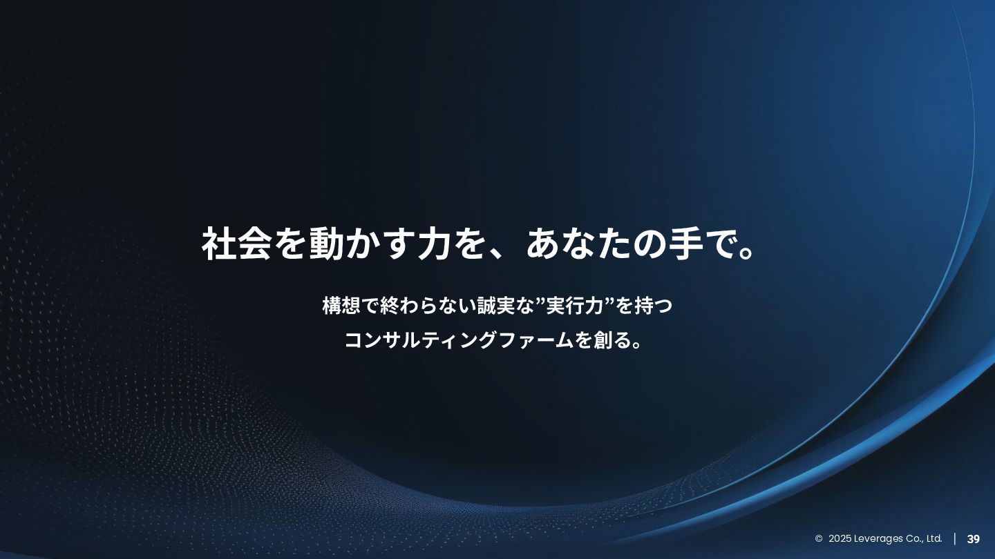 BUSINESS ⼤カテゴリー カテゴリー 主なプロジェクト例 デジタル‧AI戦略 デジタルロード マップ策定 デジタル/AI変⾰戦略 ‧AI適応機会の分析‧評価 ‧全社のデジタル‧AI変⾰ロードマップ策定 ‧経営層向けのAIによる意思決定プロセス更新‧構築⽀援 ‧AIを活⽤した新規事業‧新サービスの検討 デジタルユースケース検討‧評価 ‧⽣産性向上、コスト削減等のユースケース分析‧評価 ‧ユースケース構築の技術難易度/構築技術の評価 業務改⾰‧ オペレーション ⾼度化 機能別業務改⾰ ‧ワークフロー処理におけるエージェントAI活⽤ ‧AIを使ったマーケティングコンテンツの⽣成効率化 ‧社内問い合わせ対応対応のエージェント化‧RAG構築 ⾃動化‧効率化 ‧外部情報分析業務の⾃動化(情報収集‧統合) ‧調達タスクの⾃動化‧特定アクションの即時実⾏AI検証 ‧ロボット技術による製造⼯程効率化余地の検証 データ‧IT基盤構築 モダナイゼーション クラウド‧IT戦略/推進 ‧勘定系システムのクラウド移⾏検討 ‧⾦融SaaSデジタルプラットフォーム連携検討 ‧ITコスト最適化‧IT投資マネジメント データ‧AIプラットフォーム ‧データ基盤構築とデータ資産のAI対応⽀援 ‧LLM‧AIエンジンの評価‧使い分け検討 テクノロジー開発‧ 実装⽀援 デジタルプロダクト開発 ‧Salesforce, AWS, Azure等の導⼊⽀援‧開発 ‧コールセンターAIの実装⽀援 ⼤規模プロジェクトのPMO/QA/TO⽀援 ‧全社ERP導⼊におけるバリューアシュアランス ‧⼤⼿Slerの成果物QA 組織/⼈材変⾰‧ リスク管理 組織‧⼈材変⾰ ‧AI時代に必要なデジタル⼈材戦略‧育成計画 ‧従業員のAI利⽤率向上⽀援‧意識変⾰⽀援 ‧経営層のデジタル‧AI研修 ⼤規模プロジェクトのPMO/QA/TO⽀援 ‧データガバナンス構築‧規制対応 ‧リスクの評価‧ガードレール基準検討