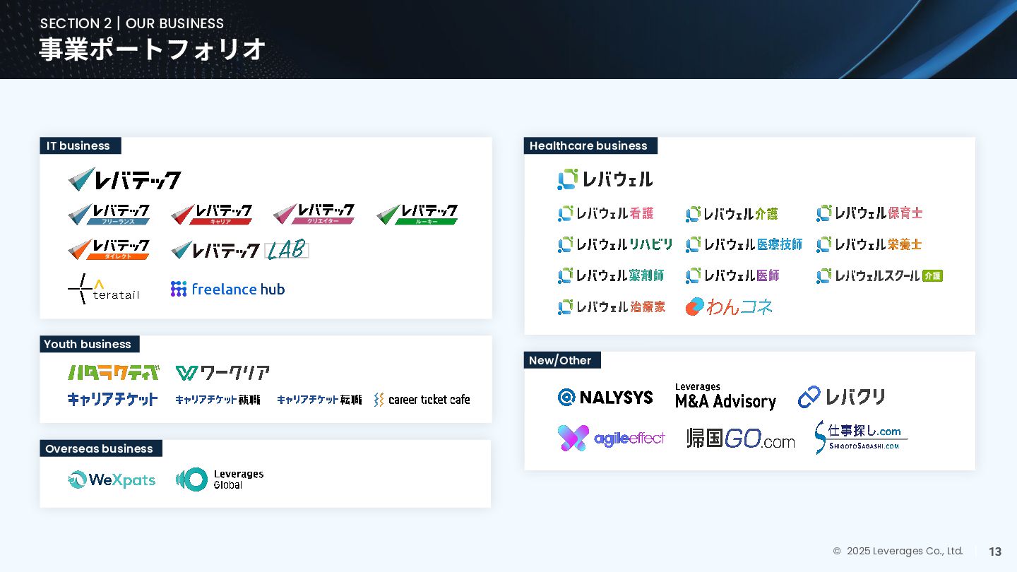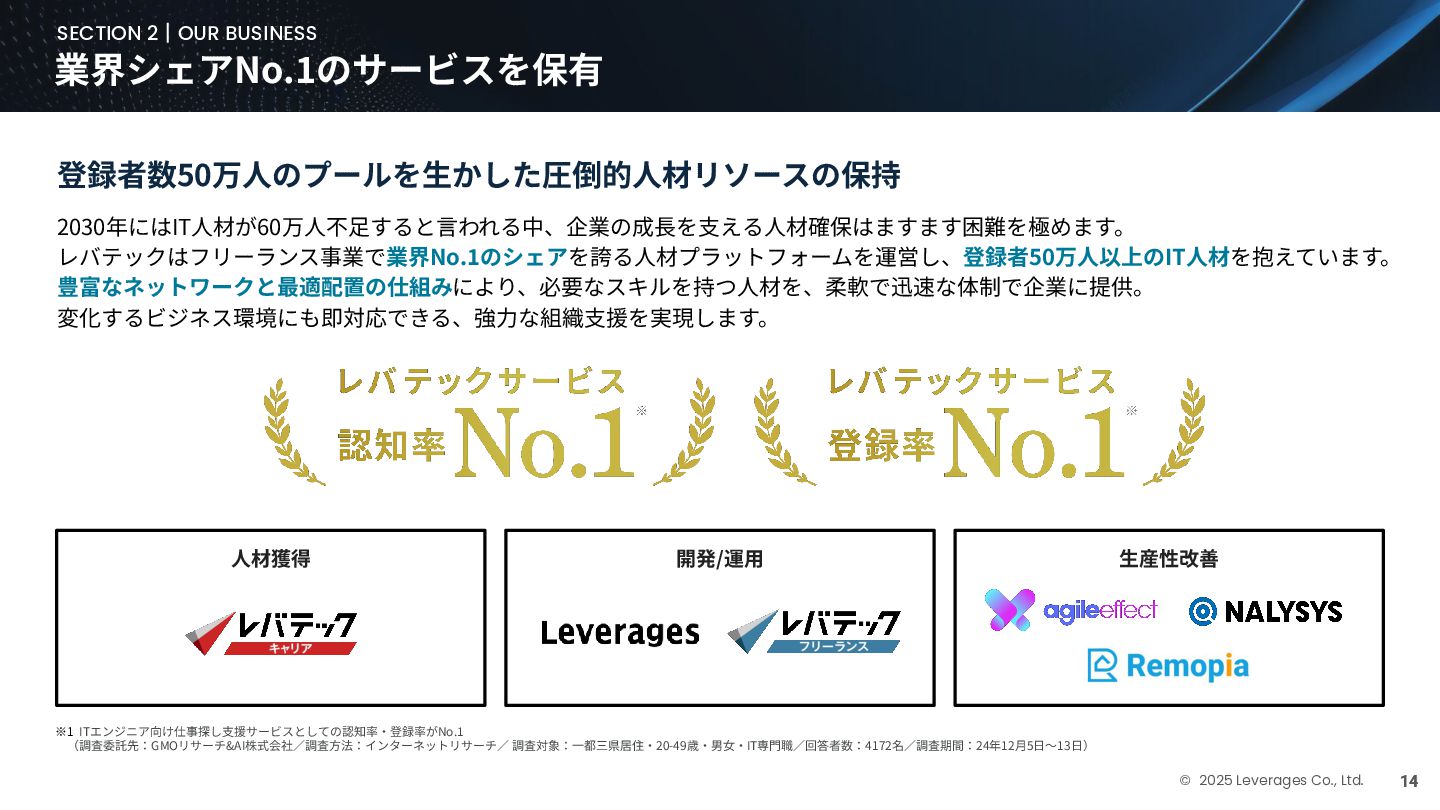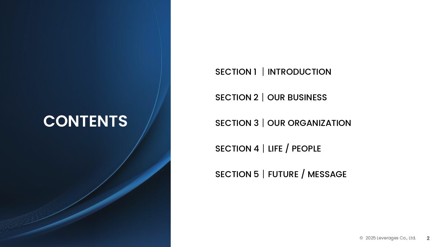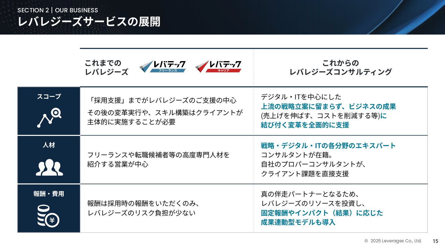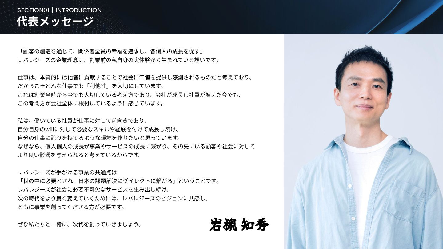 BUSINESS ⼤カテゴリー カテゴリー 主なプロジェクト例 デジタル‧AI戦略 デジタルロード マップ策定 デジタル/AI変⾰戦略 ‧AI適応機会の分析‧評価 ‧全社のデジタル‧AI変⾰ロードマップ策定 ‧経営層向けのAIによる意思決定プロセス更新‧構築⽀援 ‧AIを活⽤した新規事業‧新サービスの検討 デジタルユースケース検討‧評価 ‧⽣産性向上、コスト削減等のユースケース分析‧評価 ‧ユースケース構築の技術難易度/構築技術の評価 業務改⾰‧ オペレーション ⾼度化 機能別業務改⾰ ‧ワークフロー処理におけるエージェントAI活⽤ ‧AIを使ったマーケティングコンテンツの⽣成効率化 ‧社内問い合わせ対応対応のエージェント化‧RAG構築 ⾃動化‧効率化 ‧外部情報分析業務の⾃動化(情報収集‧統合) ‧調達タスクの⾃動化‧特定アクションの即時実⾏AI検証 ‧ロボット技術による製造⼯程効率化余地の検証 データ‧IT基盤構築 モダナイゼーション クラウド‧IT戦略/推進 ‧勘定系システムのクラウド移⾏検討 ‧⾦融SaaSデジタルプラットフォーム連携検討 ‧ITコスト最適化‧IT投資マネジメント データ‧AIプラットフォーム ‧データ基盤構築とデータ資産のAI対応⽀援 ‧LLM‧AIエンジンの評価‧使い分け検討 テクノロジー開発‧ 実装⽀援 デジタルプロダクト開発 ‧Salesforce, AWS, Azure等の導⼊⽀援‧開発 ‧コールセンターAIの実装⽀援 ⼤規模プロジェクトのPMO/QA/TO⽀援 ‧全社ERP導⼊におけるバリューアシュアランス ‧⼤⼿Slerの成果物QA 組織/⼈材変⾰‧ リスク管理 組織‧⼈材変⾰ ‧AI時代に必要なデジタル⼈材戦略‧育成計画 ‧従業員のAI利⽤率向上⽀援‧意識変⾰⽀援 ‧経営層のデジタル‧AI研修 ⼤規模プロジェクトのPMO/QA/TO⽀援 ‧データガバナンス構築‧規制対応 ‧リスクの評価‧ガードレール基準検討