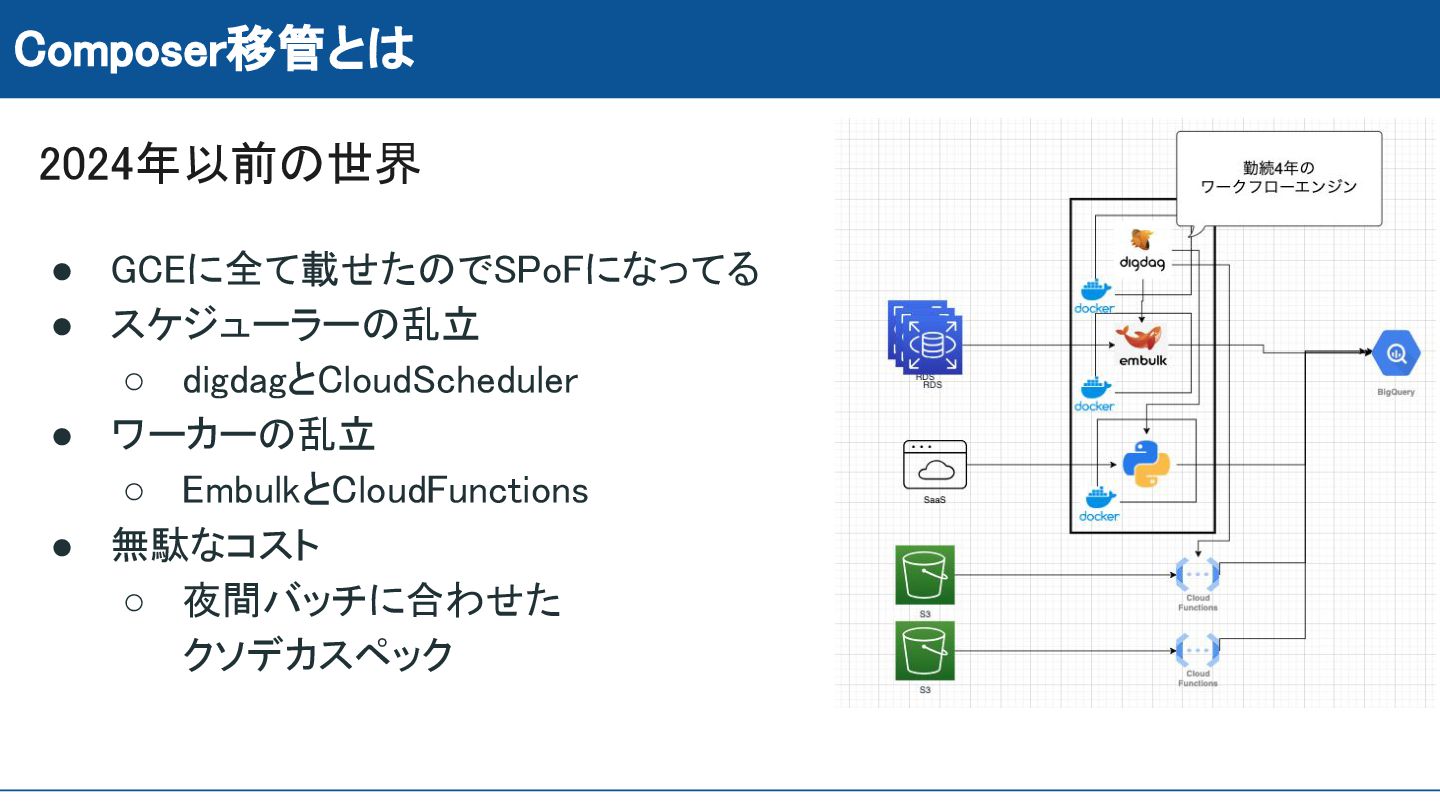 ワーカーの乱立 ◦ EmbulkとCloudFunctions • 無駄なコスト ◦ 夜間バッチに合わせた クソデカスペック