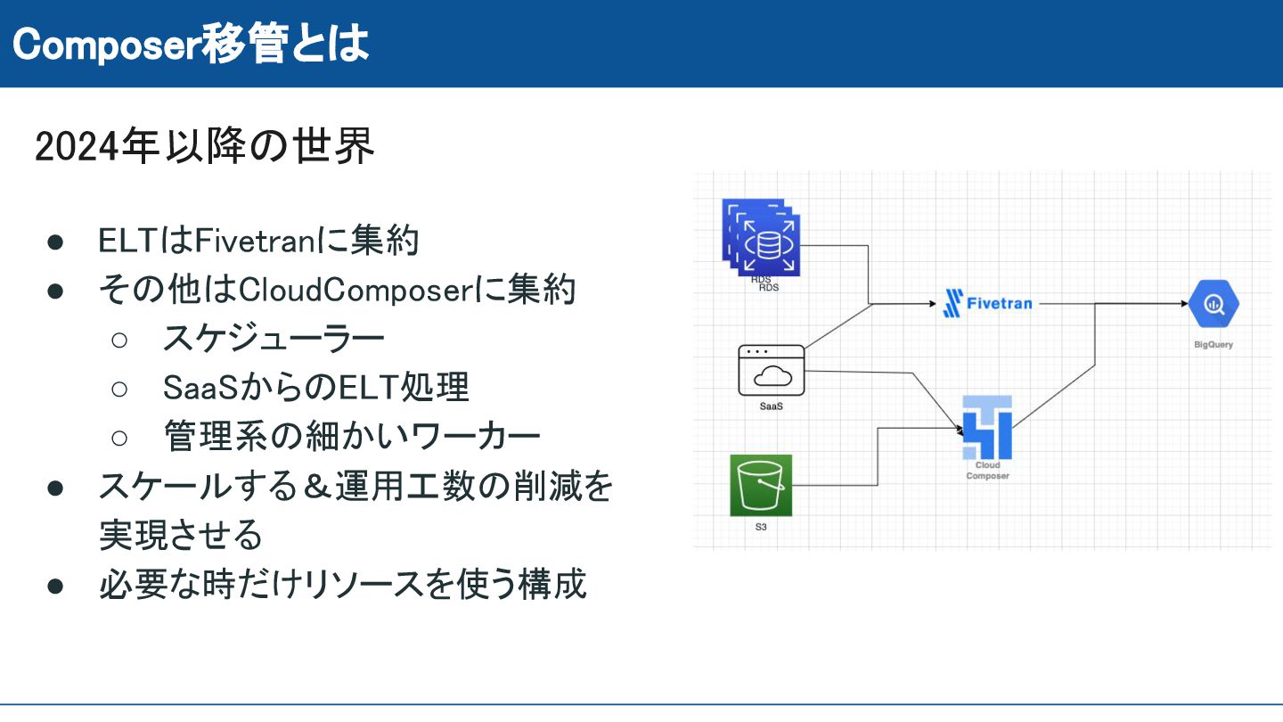 Composer移管とは 2024年以降の世界 • ELTはFivetranに集約 • その他はCloudComposerに集約 ◦ スケジューラー ◦
