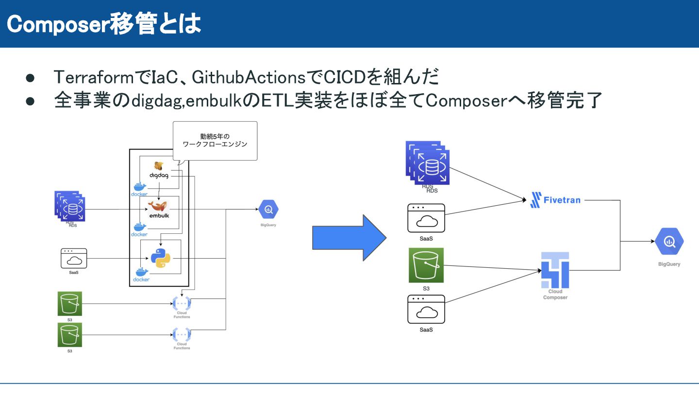 • TerraformでIaC、GithubActionsでCICDを組んだ • 全事業のdigdag,embulkのETL実装をほぼ全てComposerへ移管完了 Composer移管とは