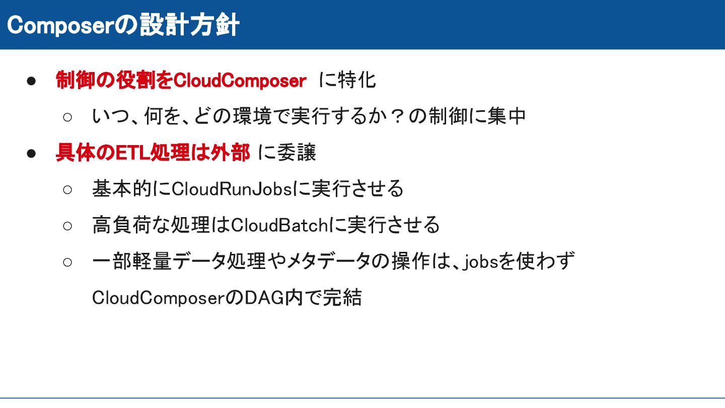◦ 基本的にCloudRunJobsに実行させる ◦ 高負荷な処理はCloudBatchに実行させる ◦ 一部軽量データ処理やメタデータの操作は、jobsを使わず CloudComposerのDAG内で完結