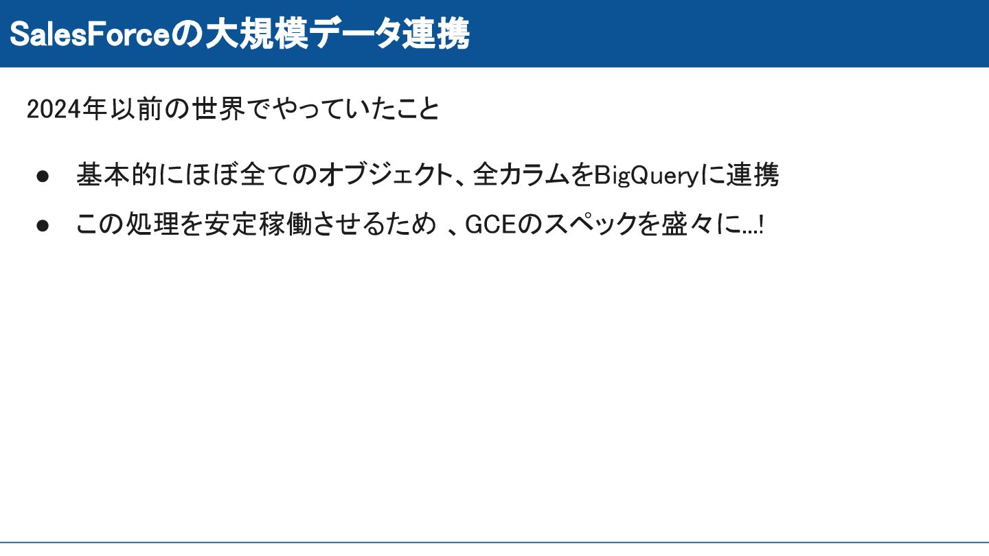 SalesForceの大規模データ連携 2024年以前の世界でやっていたこと • 基本的にほぼ全てのオブジェクト、全カラムをBigQueryに連携 • この処理を安定稼働させるため 、GCEのスペックを盛々に...!