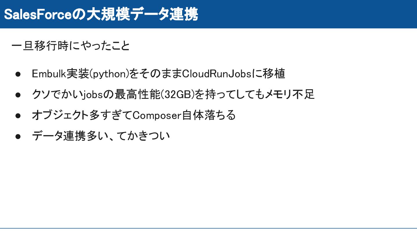 SalesForceの大規模データ連携 一旦移行時にやったこと • Embulk実装(python)をそのままCloudRunJobsに移植 • クソでかいjobsの最高性能(32GB)を持ってしてもメモリ不足 • オブジェクト多すぎてComposer自体落ちる •