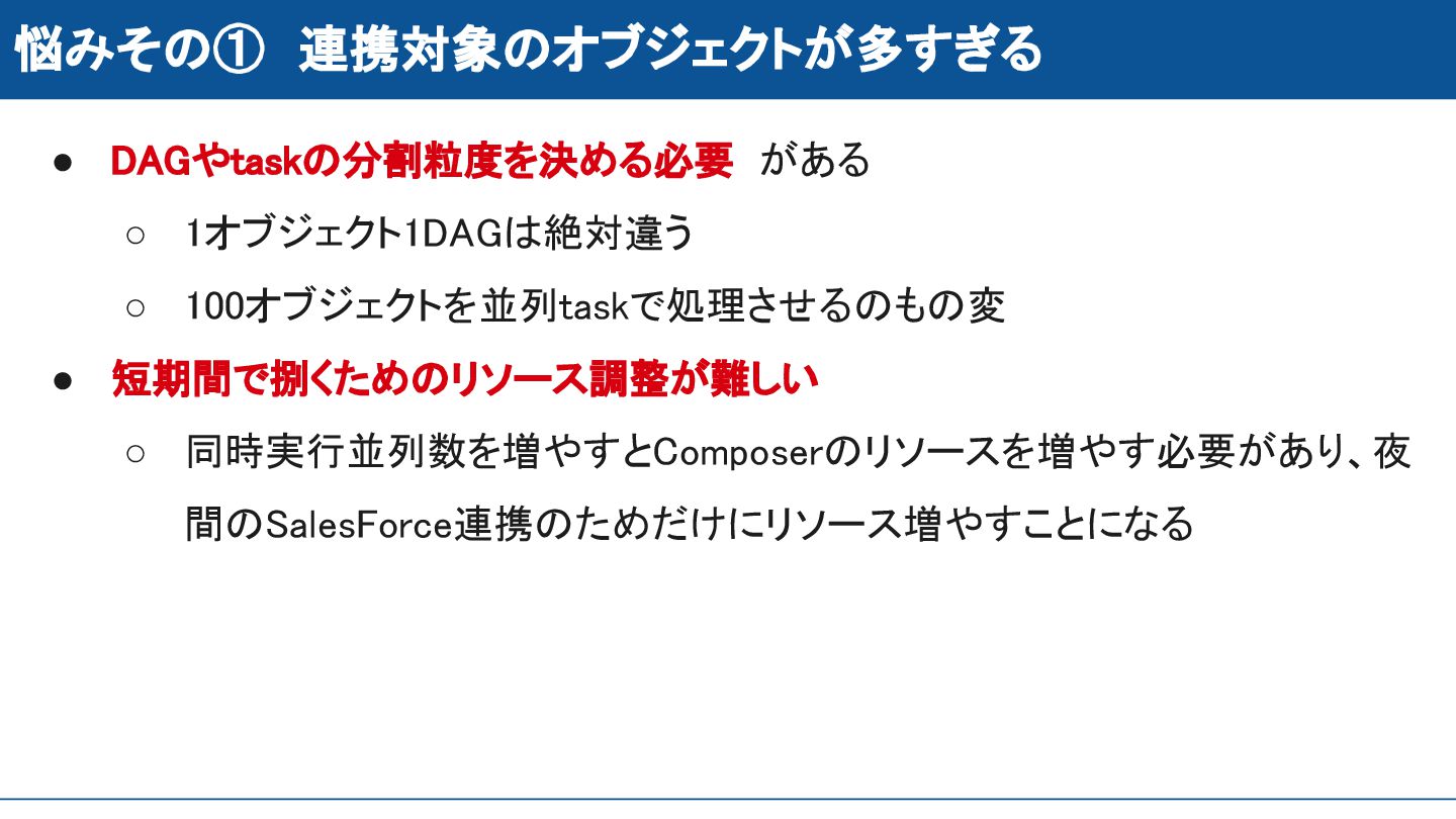 短期間で捌くためのリソース調整が難しい ◦ 同時実行並列数を増やすとComposerのリソースを増やす必要があり、夜 間のSalesForce連携のためだけにリソース増やすことになる