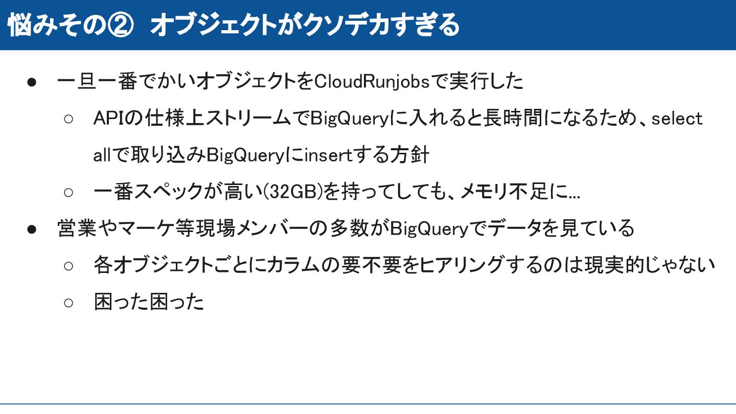 悩みその② オブジェクトがクソデカすぎる • 一旦一番でかいオブジェクトをCloudRunjobsで実行した ◦ APIの仕様上ストリームでBigQueryに入れると長時間になるため、select allで取り込みBigQueryにinsertする方針 ◦ 一番スペックが高い(32GB)を持ってしても、メモリ不足に... •