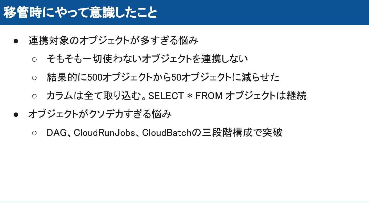 移管時にやって意識したこと • 連携対象のオブジェクトが多すぎる悩み ◦ そもそも一切使わないオブジェクトを連携しない ◦ 結果的に500オブジェクトから50オブジェクトに減らせた ◦ カラムは全て取り込む。SELECT