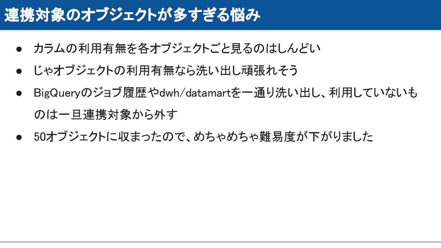 連携対象のオブジェクトが多すぎる悩み • カラムの利用有無を各オブジェクトごと見るのはしんどい • じゃオブジェクトの利用有無なら洗い出し頑張れそう • BigQueryのジョブ履歴やdwh/datamartを一通り洗い出し、利用していないも のは一旦連携対象から外す •