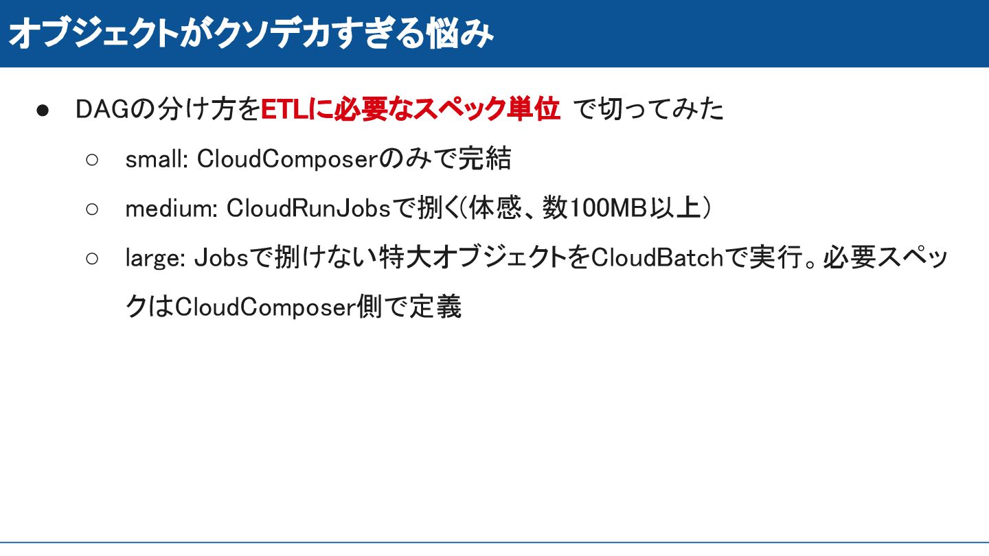CloudRunJobsで捌く(体感、数100MB以上) ◦ large: Jobsで捌けない特大オブジェクトをCloudBatchで実行。必要スペッ クはCloudComposer側で定義