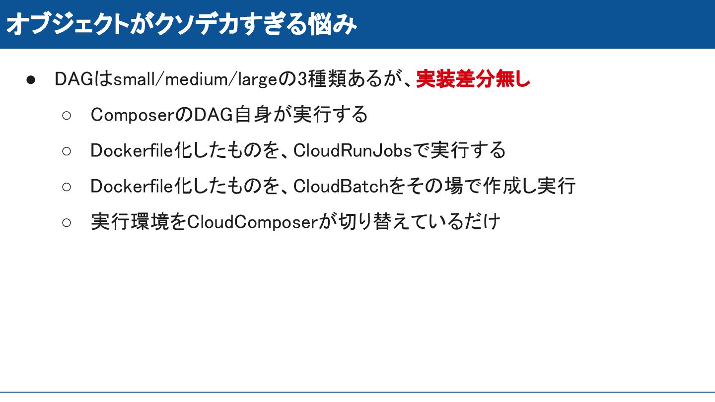 オブジェクトがクソデカすぎる悩み • DAGはsmall/medium/largeの3種類あるが、実装差分無し ◦ ComposerのDAG自身が実行する ◦ Dockerfile化したものを、CloudRunJobsで実行する ◦