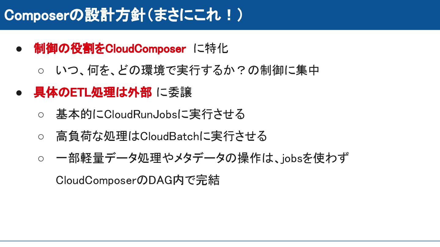 Composerの設計方針(まさにこれ!) • 制御の役割をCloudComposer に特化 ◦ いつ、何を、どの環境で実行するか?の制御に集中 • 具体のETL処理は外部 に委譲