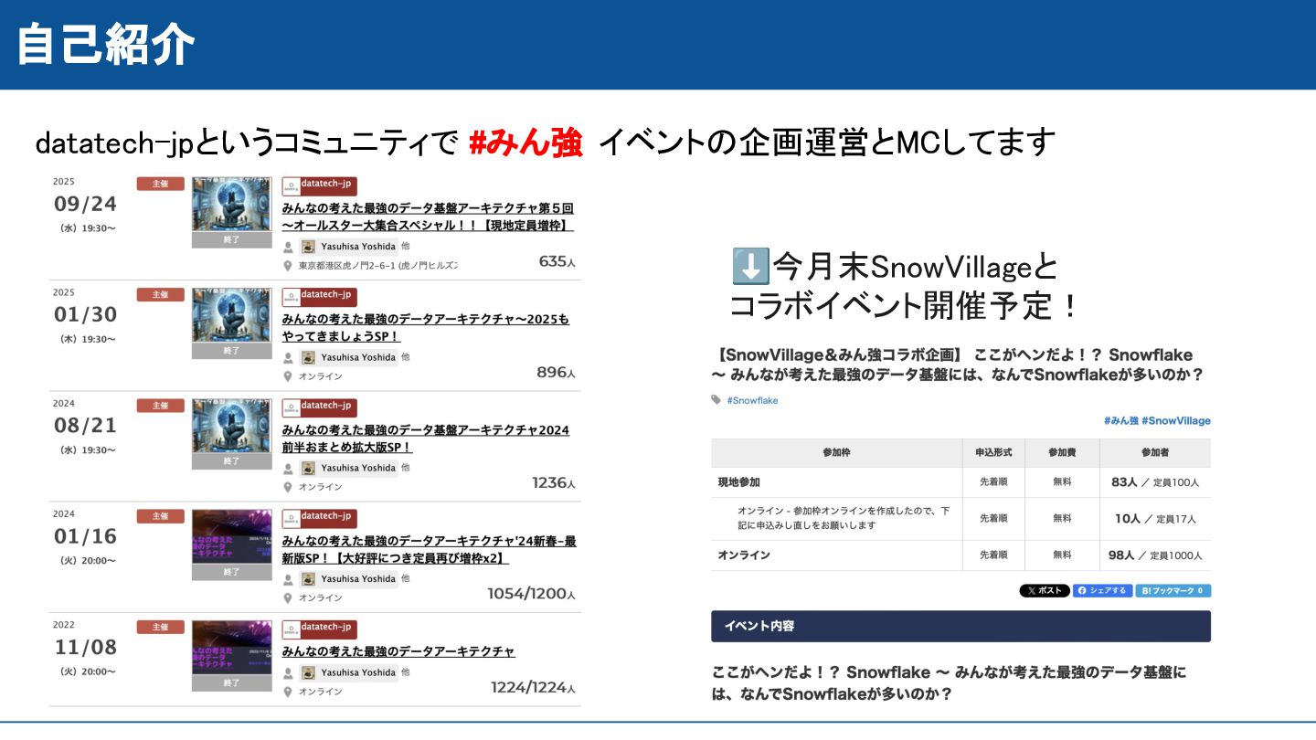 datatech-jpというコミュニティで #みん強 イベントの企画運営とMCしてます 自己紹介 ⬇今月末SnowVillageと コラボイベント開催予定!
