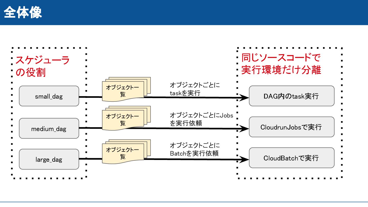 DAG内のtask実行 CloudrunJobsで実行 CloudBatchで実行 同じソースコードで 実行環境だけ分離 スケジューラ の役割 オブジェクトごとにJobs を実行依頼 オブジェクトごとに Batchを実行依頼 オブジェクトごとに taskを実行