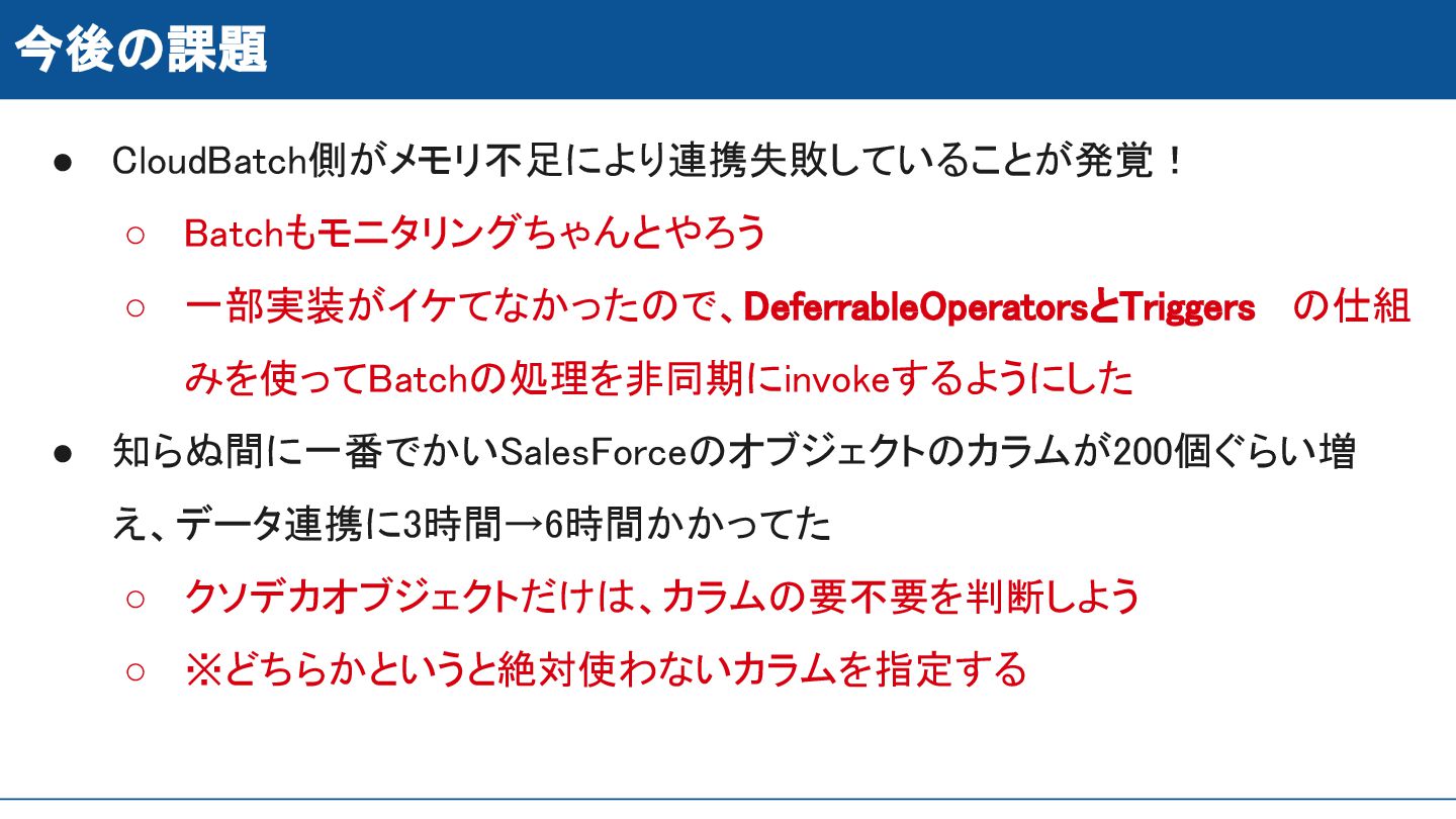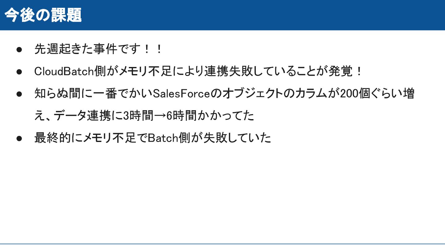 今後の課題 • 先週起きた事件です!! • CloudBatch側がメモリ不足により連携失敗していることが発覚! • 知らぬ間に一番でかいSalesForceのオブジェクトのカラムが200個ぐらい増 え、データ連携に3時間→6時間かかってた •