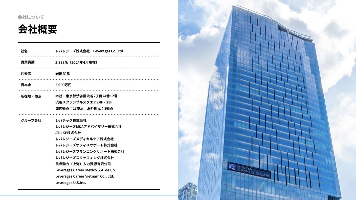 (最新の数値に更新する) デザイン調整する 社名 従業員数 代表者 資本⾦ 所在地‧拠点 グループ会社 レバレジーズ株式会社 Leverages Co.,Ltd. 2,838名(2024年4⽉現在) 岩槻 知秀 5,000万円 本社:東京都渋⾕区渋⾕2丁⽬24番12号 渋⾕スクランブルスクエア24F‧25F 国内拠点:27拠点 海外拠点:3拠点 レバテック株式会社 レバレジーズM&Aアドバイザリー株式会社 ATLIKE株式会社 レバレジーズメディカルケア株式会社 レバレジーズオフィスサポート株式会社 レバレジーズプランニングサポート株式会社 レバレジーズスタッフィング株式会社 員点動⼒(上海)⼈⼒資源有限公司 Leverages Career Mexico S.A. de C.V. Leverages Career Vietnam Co., Ltd. Leverages U.S.Inc. 会社について