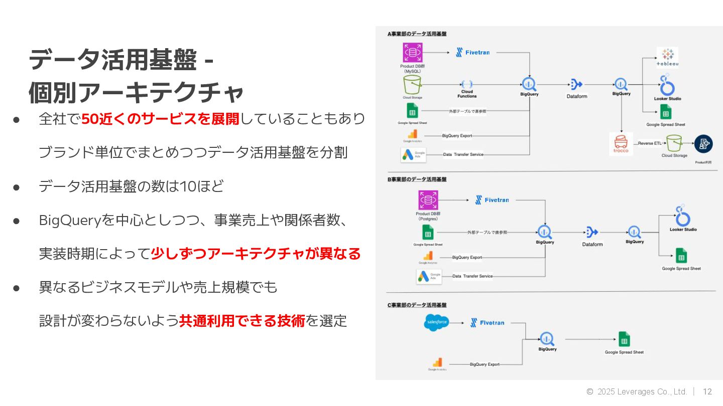 12 © 2025 Leverages Co., Ltd. データ活用基盤 - 個別アーキテクチャ •