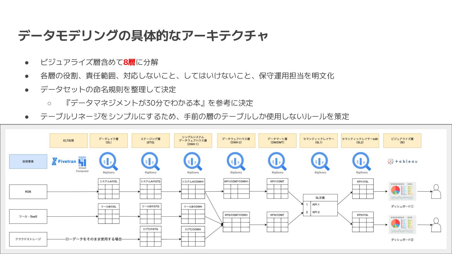 各層の役割、責任範囲、対応しないこと、してはいけないこと、保守運用担当を明文化 • データセットの命名規則を整理して決定 ◦ 『データマネジメントが30分でわかる本』を参考に決定 • テーブルリネージをシンプルにするため、手前の層のテーブルしか使用しないルールを策定
