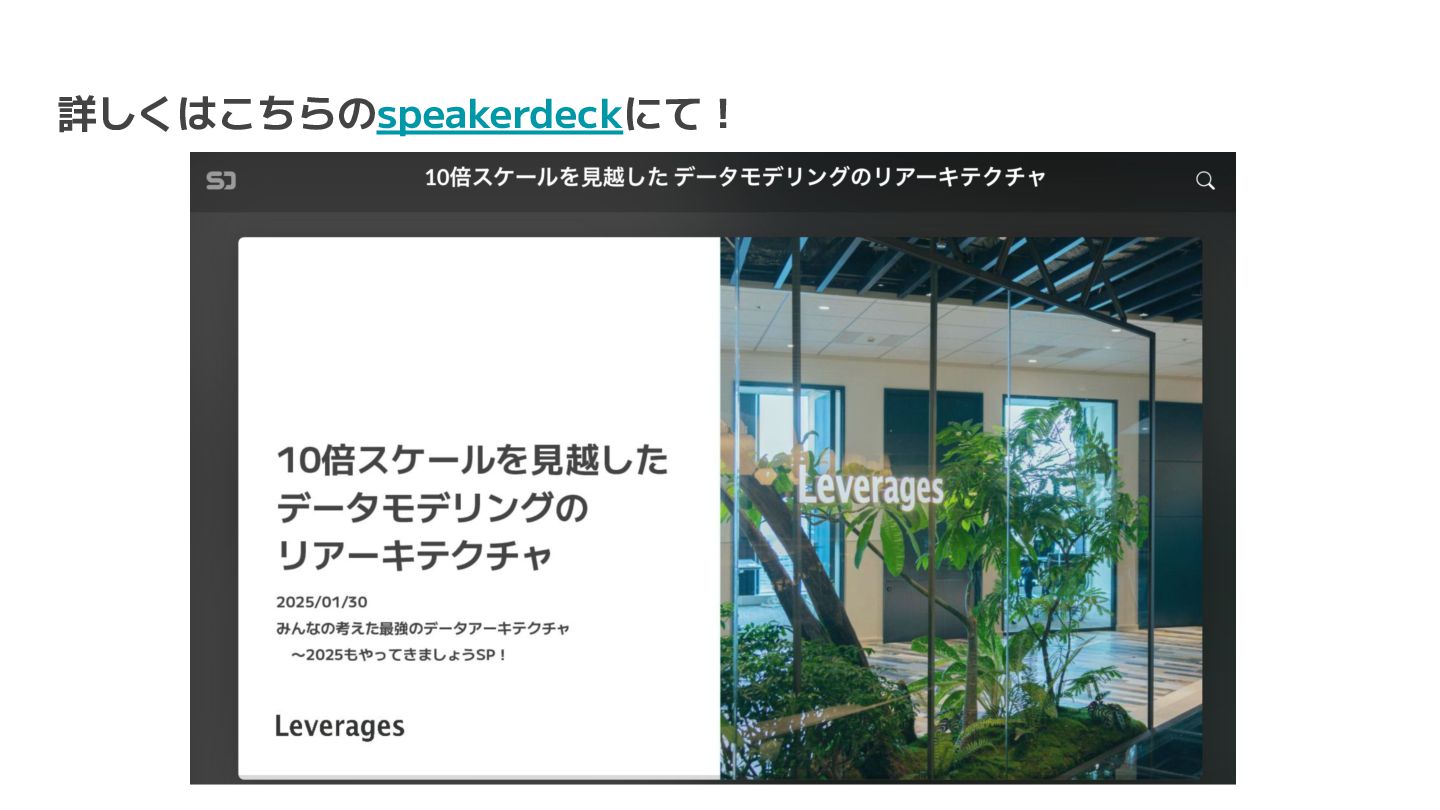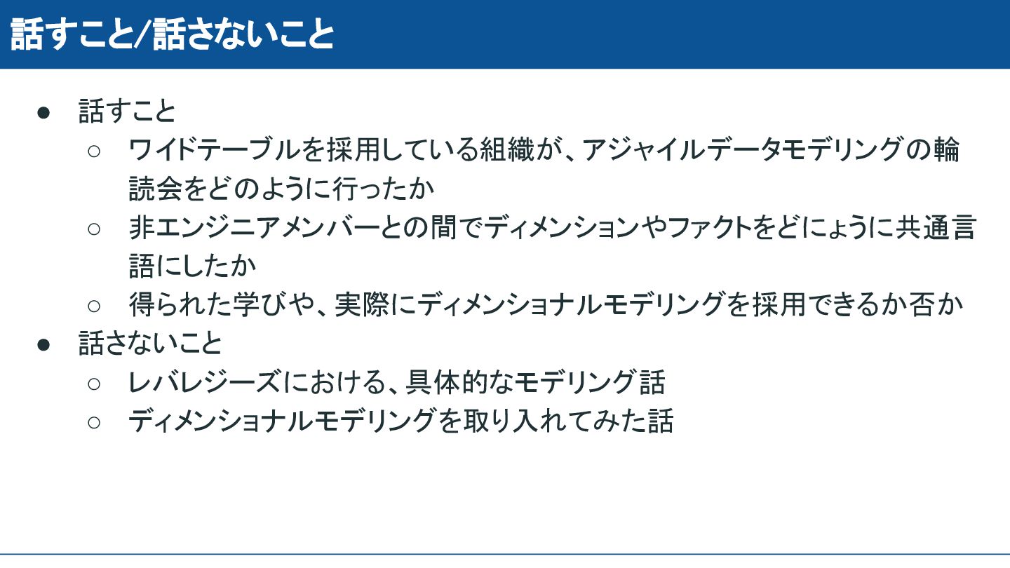 ◦ 得られた学びや、実際にディメンショナルモデリングを採用できるか否か • 話さないこと ◦ レバレジーズにおける、具体的なモデリング話 ◦ ディメンショナルモデリングを取り入れてみた話