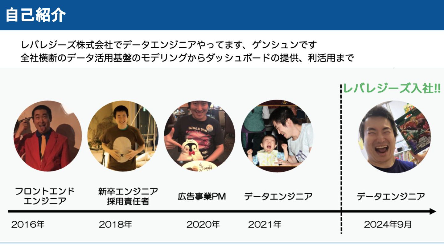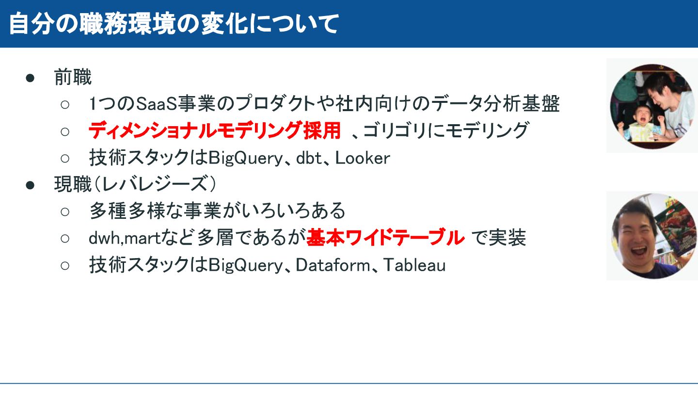 技術スタックはBigQuery、dbt、Looker • 現職(レバレジーズ) ◦ 多種多様な事業がいろいろある ◦ dwh,martなど多層であるが基本ワイドテーブル で実装 ◦ 技術スタックはBigQuery、Dataform、Tableau