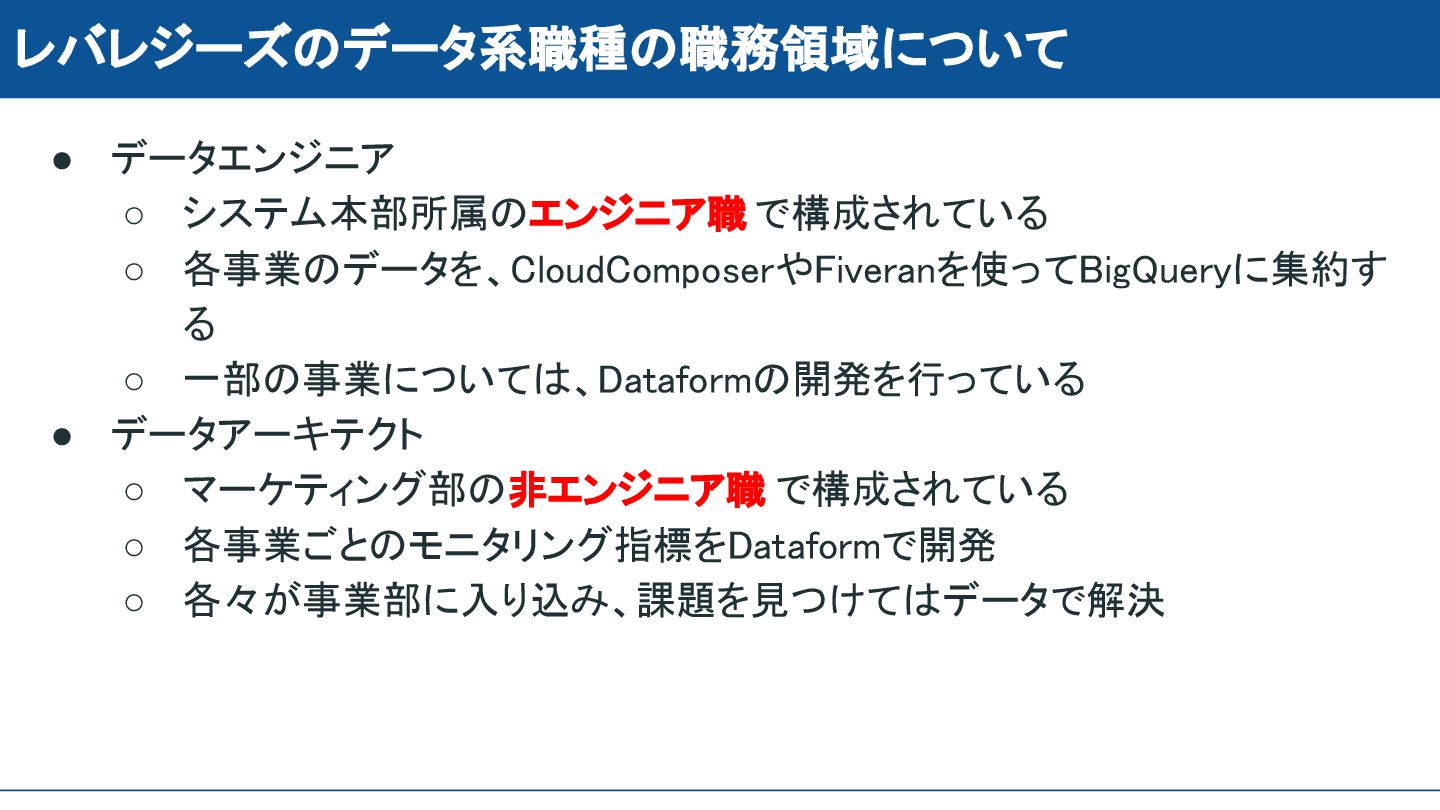 レバレジーズのデータ系職種の職務領域について • データエンジニア ◦ システム本部所属のエンジニア職 で構成されている ◦ 各事業のデータを、CloudComposerやFiveranを使ってBigQueryに集約す る