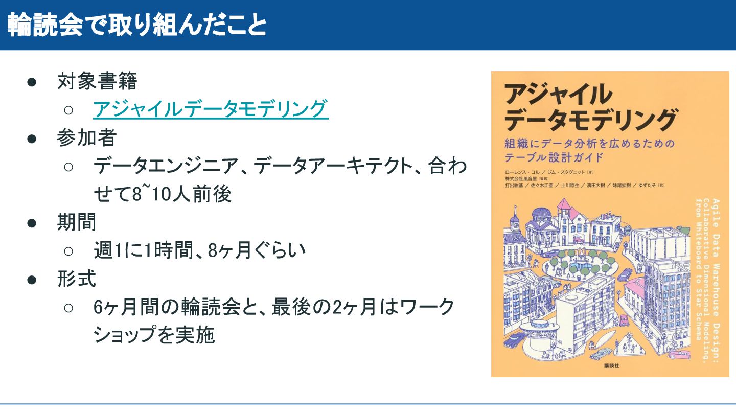輪読会で取り組んだこと • 対象書籍 ◦ アジャイルデータモデリング • 参加者 ◦ データエンジニア、データアーキテクト、合わ