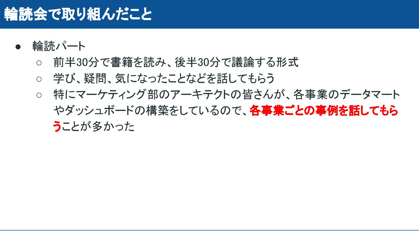 輪読会で取り組んだこと • 輪読パート ◦ 前半30分で書籍を読み、後半30分で議論する形式 ◦ 学び、疑問、気になったことなどを話してもらう ◦ 特にマーケティング部のアーキテクトの皆さんが、各事業のデータマート