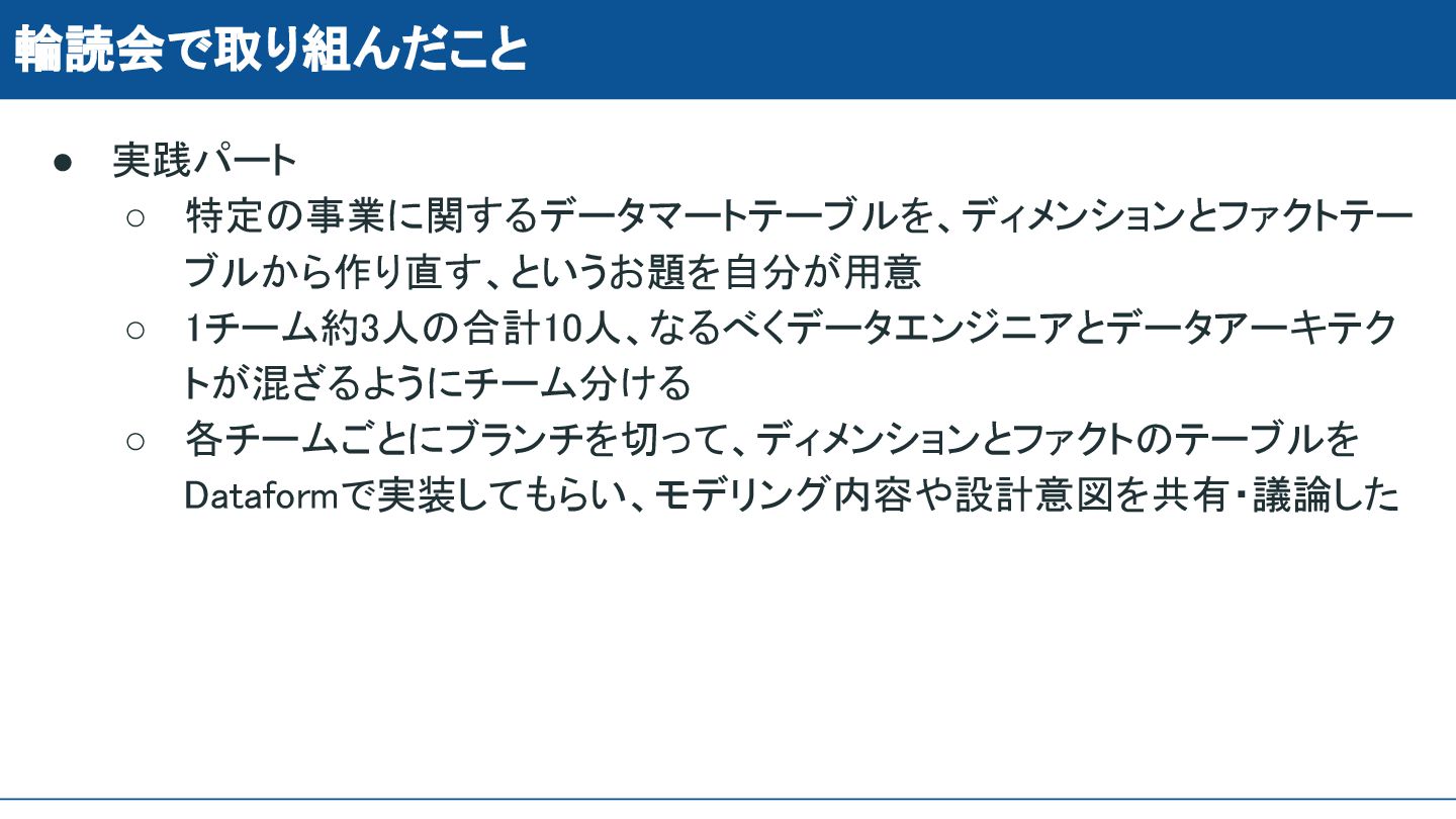 輪読会で取り組んだこと • 実践パート ◦ 特定の事業に関するデータマートテーブルを、ディメンションとファクトテー ブルから作り直す、というお題を自分が用意 ◦ 1チーム約3人の合計10人、なるべくデータエンジニアとデータアーキテク トが混ざるようにチーム分ける