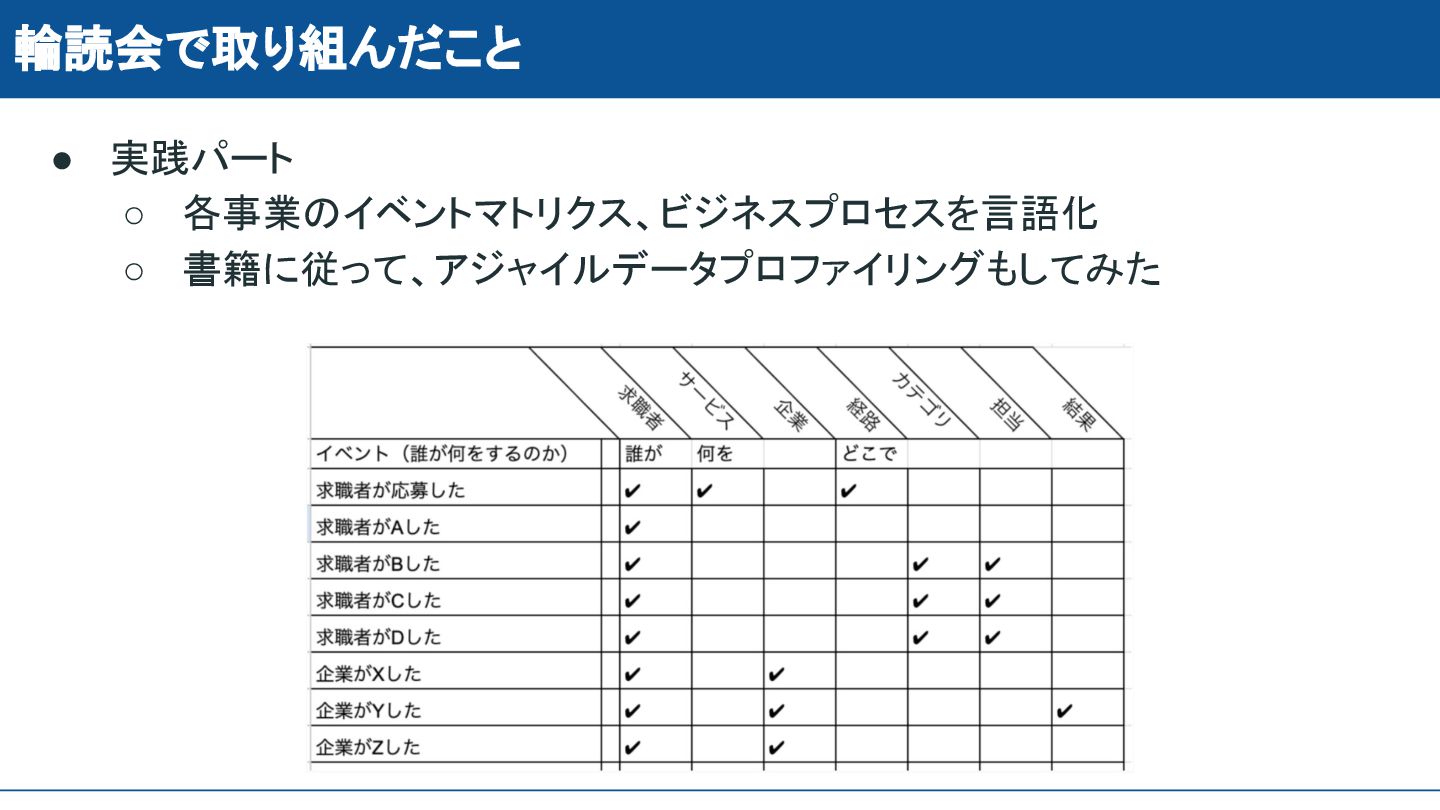 輪読会で取り組んだこと • 実践パート ◦ 各事業のイベントマトリクス、ビジネスプロセスを言語化 ◦ 書籍に従って、アジャイルデータプロファイリングもしてみた