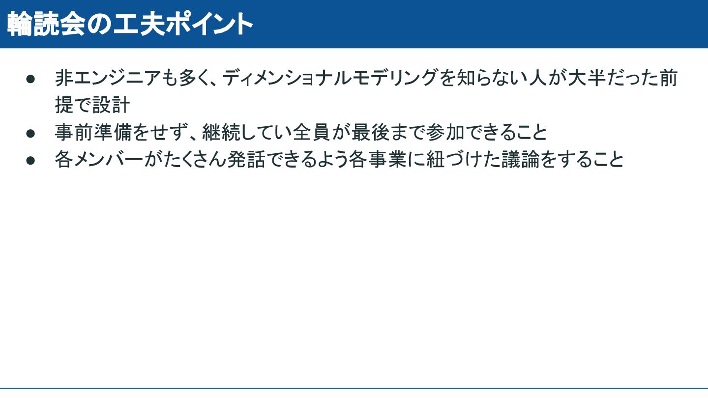 輪読会の工夫ポイント • 非エンジニアも多く、ディメンショナルモデリングを知らない人が大半だった前 提で設計 • 事前準備をせず、継続してい全員が最後まで参加できること • 各メンバーがたくさん発話できるよう各事業に紐づけた議論をすること