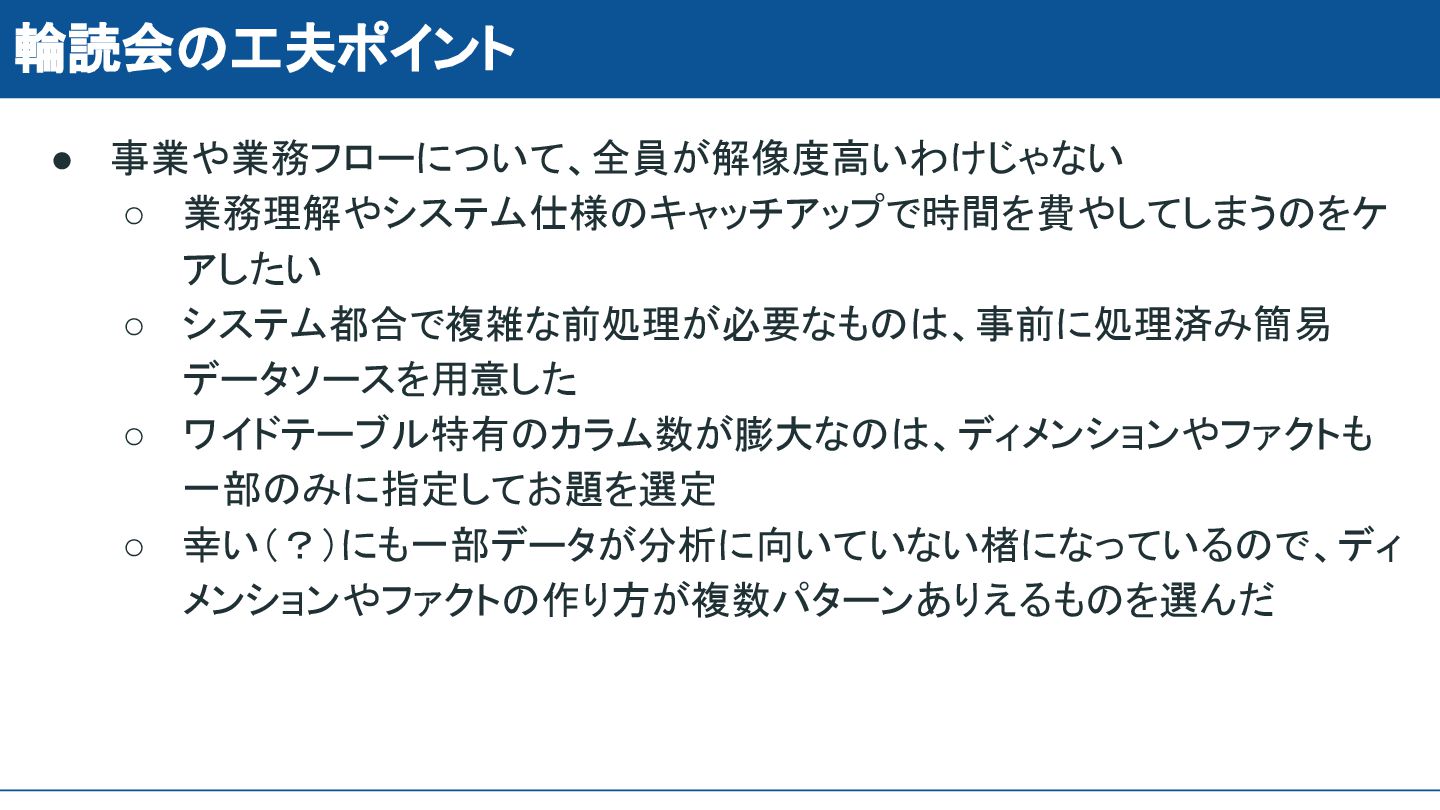 輪読会の工夫ポイント • 事業や業務フローについて、全員が解像度高いわけじゃない ◦ 業務理解やシステム仕様のキャッチアップで時間を費やしてしまうのをケ アしたい ◦ システム都合で複雑な前処理が必要なものは、事前に処理済み簡易 データソースを用意した