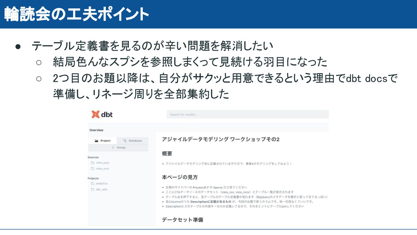 輪読会の工夫ポイント • テーブル定義書を見るのが辛い問題を解消したい ◦ 結局色んなスプシを参照しまくって見続ける羽目になった ◦ 2つ目のお題以降は、自分がサクッと用意できるという理由でdbt docsで 準備し、リネージ周りを全部集約した