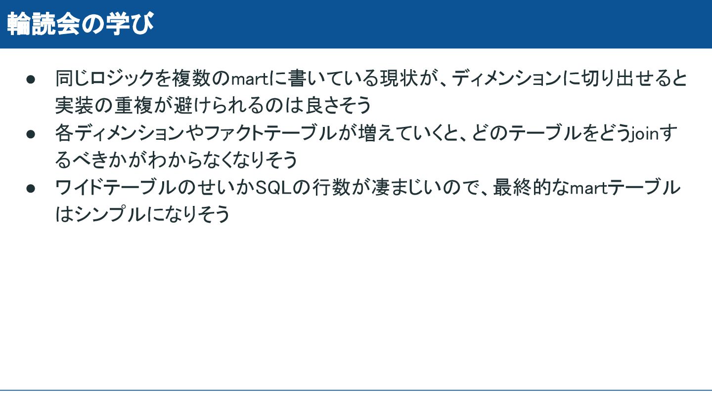 輪読会の学び • 同じロジックを複数のmartに書いている現状が、ディメンションに切り出せると 実装の重複が避けられるのは良さそう • 各ディメンションやファクトテーブルが増えていくと、どのテーブルをどうjoinす るべきかがわからなくなりそう • ワイドテーブルのせいかSQLの行数が凄まじいので、最終的なmartテーブル