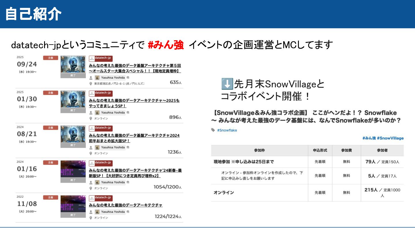 datatech-jpというコミュニティで #みん強 イベントの企画運営とMCしてます 自己紹介 ⬇先月末SnowVillageと コラボイベント開催!