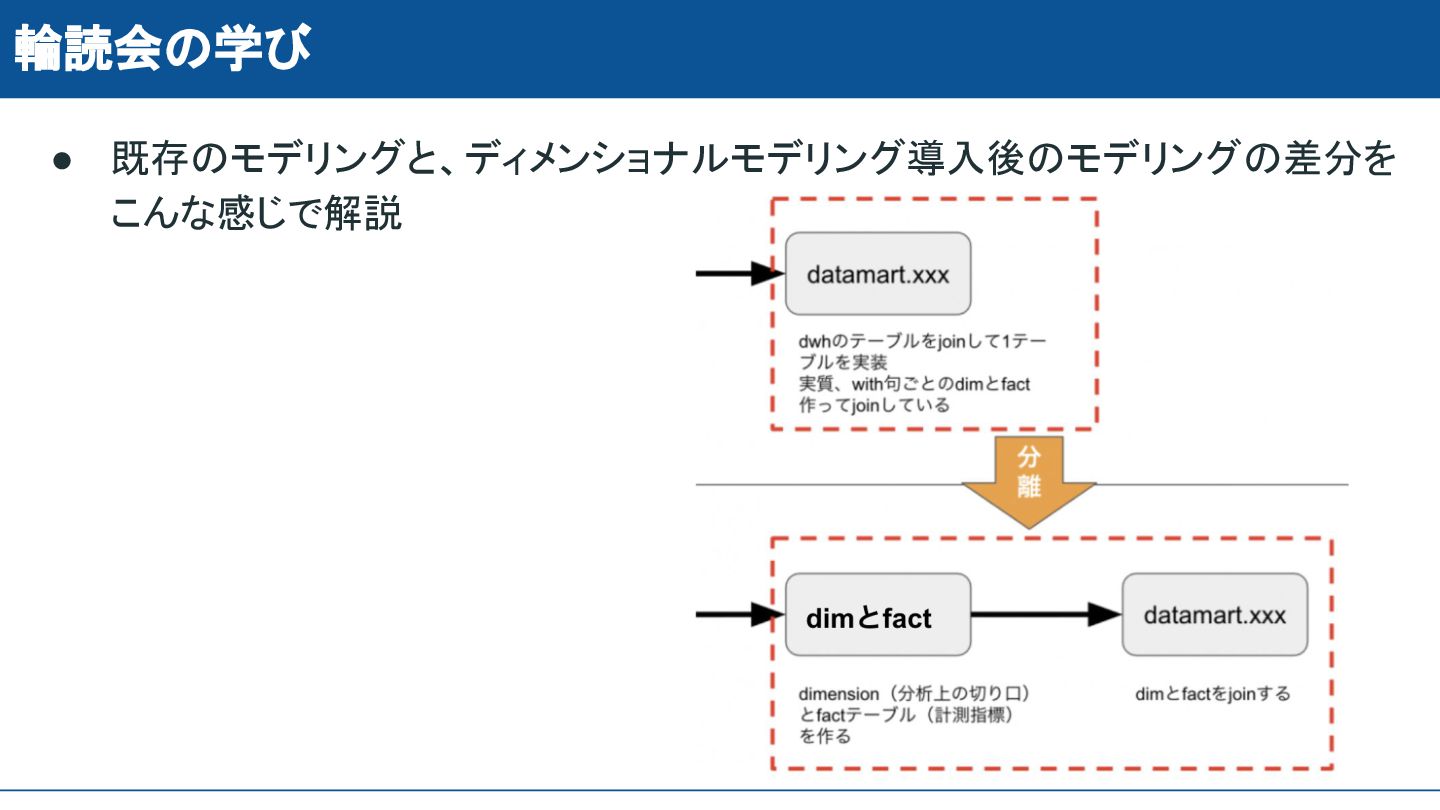 輪読会の学び • 既存のモデリングと、ディメンショナルモデリング導入後のモデリングの差分を こんな感じで解説
