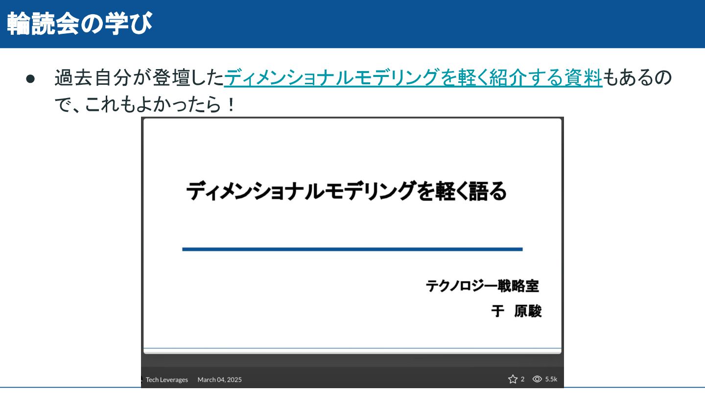 輪読会の学び • 過去自分が登壇したディメンショナルモデリングを軽く紹介する資料もあるの で、これもよかったら!
