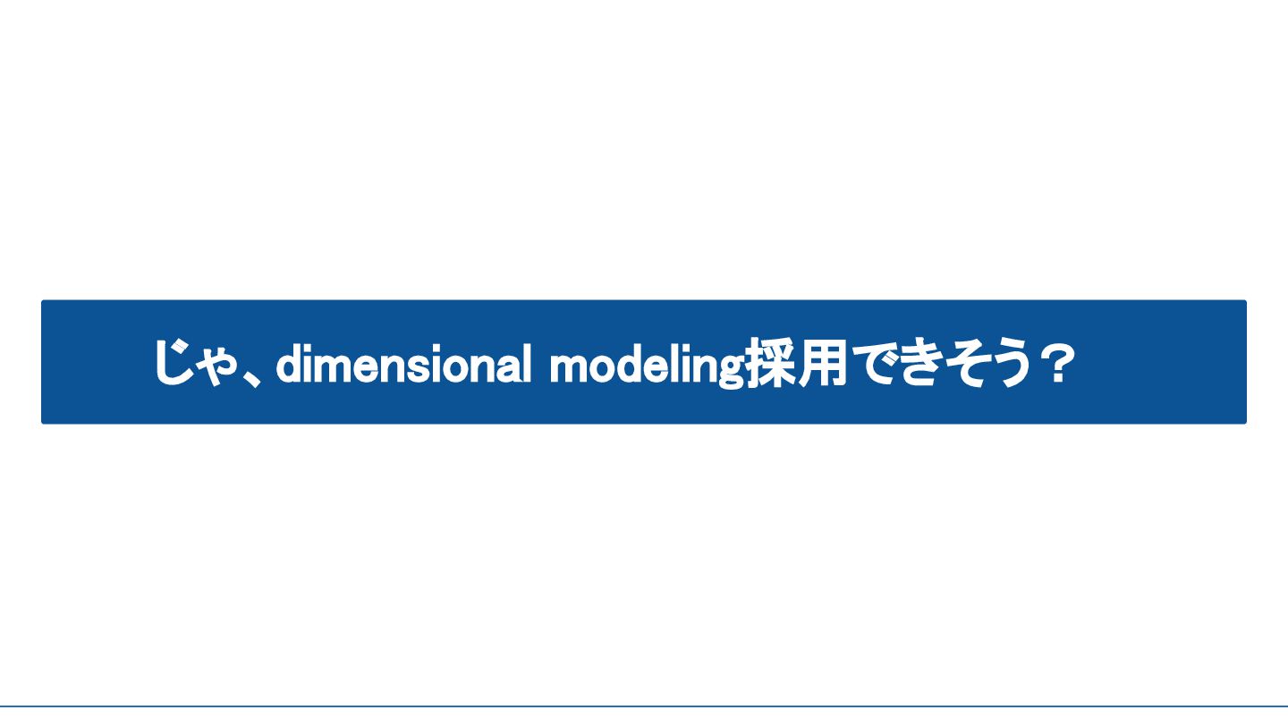 したい • ディメンショナルモデリングで課題が解消できるか今は怪しい ◦ 多分、なんちゃってモデリングを導入してしまうと、結果的にテーブルjoin の難易度が高くなり、参照祭りになりそう